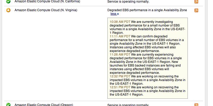 Today's outage appears to be centered around their EC2 operations with Amazon's status for the area currently flipped to "performance issues." This status does not include official word from Amazon as of yet, but the cards do not lie. The EC2 status as listed by Amazon's own Amazon Web Services status listing have gone from "degraded performance" at 10:30 AM PDT to "new launches for EBS backed instances are failing" closer to 11:30 AM PDT.