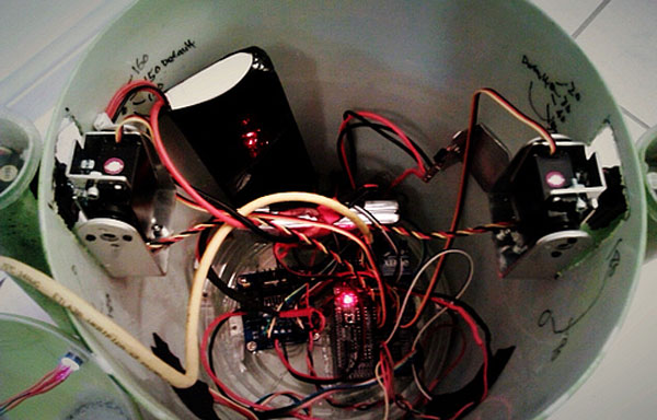 If you are a fan of the Android operating system, you will recognize the geeky remote controlled robot you see in the photo below. This is the Android mascot and a geek from Taiwan made the bot using some elbow grease, a trashcan, and Arduino among other things. The bot is very cool and the body and head are made from a trashcan that was modded for the project.