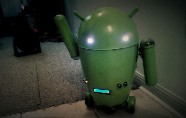 The robots arms can move up and down and instead of little stubby legs, this robot has wheels that it rolls around on. The bots eyes are made with a pair of green LED lights. The power switch is on the back and you can see the robot in action in the videos below. That Android fans and fans of DIY will get a kick out of out of this cool project. Hit the source for tons more pictures.
