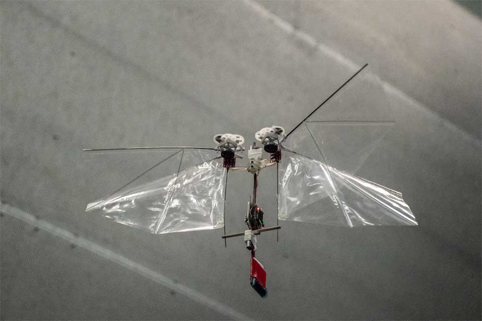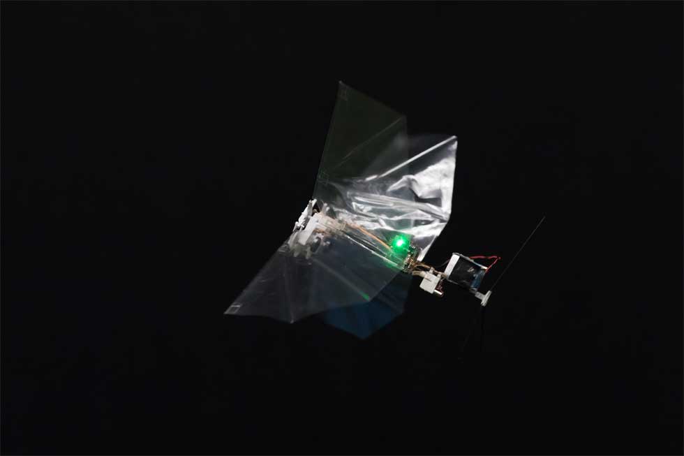The top speed for the robot is 25 km/h and it can perform aggressive maneuvers such as 360-degree flips that are like loops and barrel rolls. The wingspan of the robot is 33cm and it weighs 29 grams. That size and weight give power efficiency allowing for five minutes of hovering flight and more than 1km of range on a fully charged battery.
