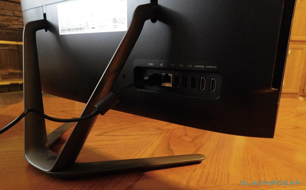 The AiO has two sections of ports, one on the back of the display and one along the left edge. The edge includes an SD card slot, pair of USB ports, and such while the rear panel has the port for the power adapter, as well as Ethernet, a few extra USB ports, and two HDMI ports. It is positioned in such a way that the cables won't interfere with adjusting the display's stand, though the cables can be weaved through the stand's centermost portion to help keep them contained.