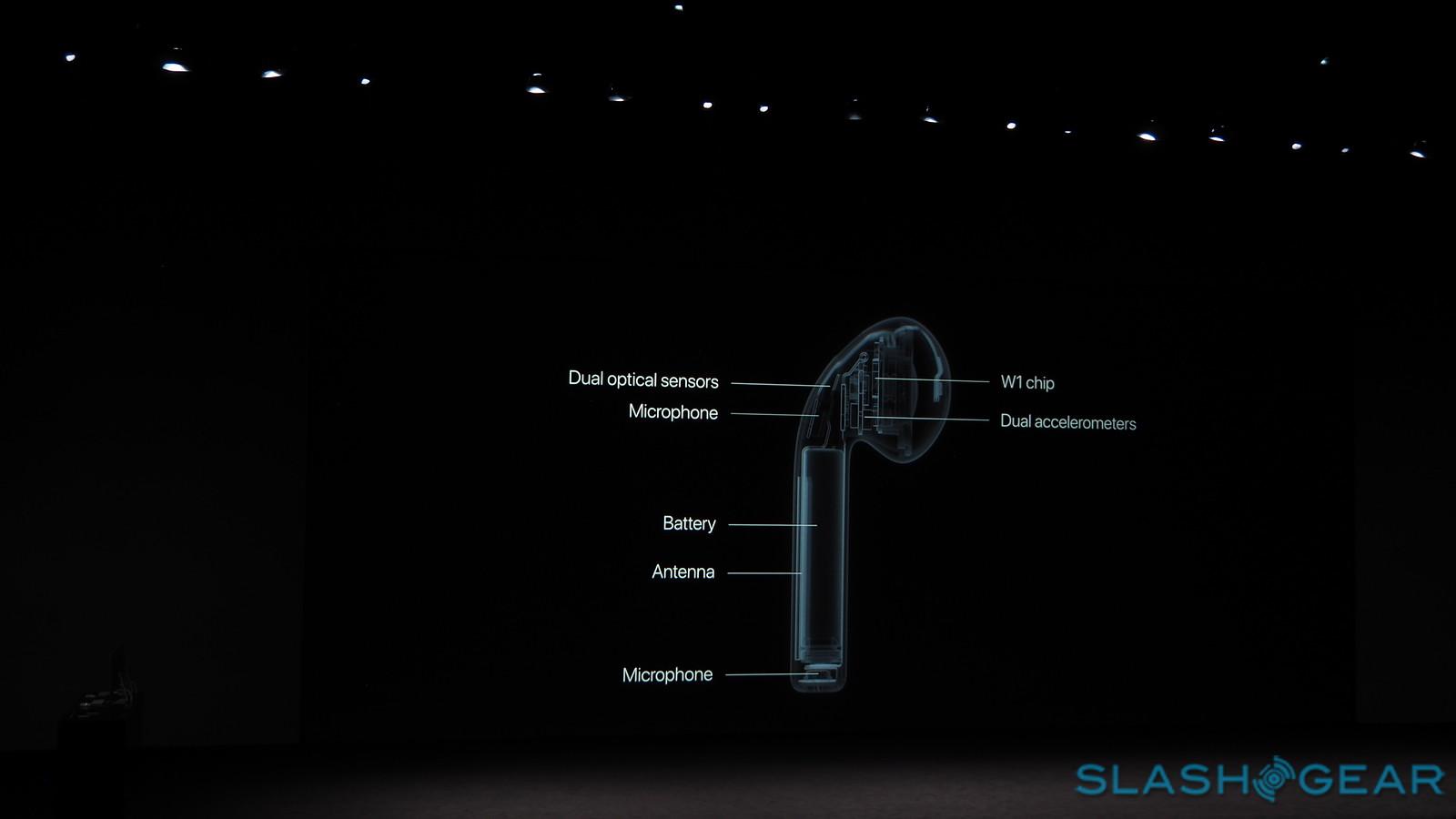 Each has infra-red sensors to detect when the AirPod is in the ear, only playing when they're in place. Accelerometers are used for tap controls: you can trigger Siri, for instance, by tapping an AirPod.