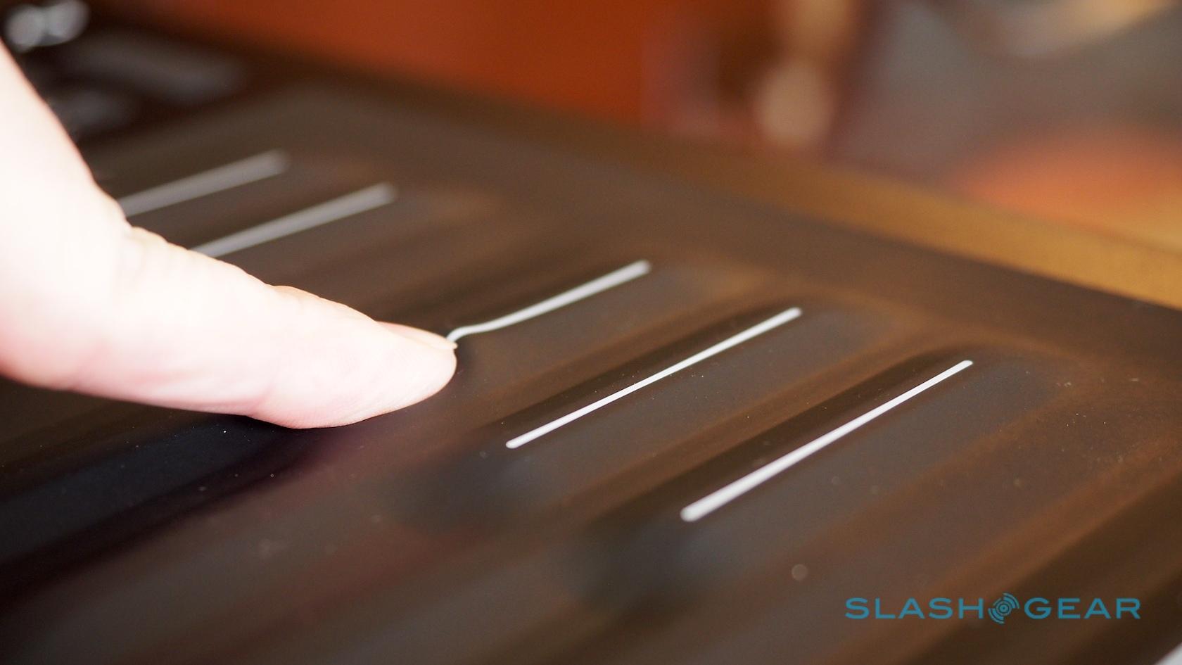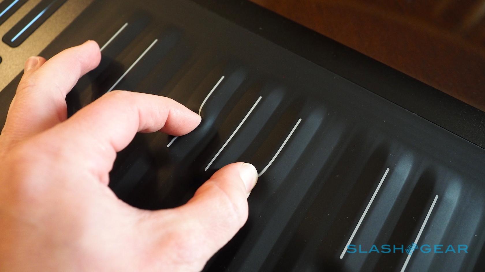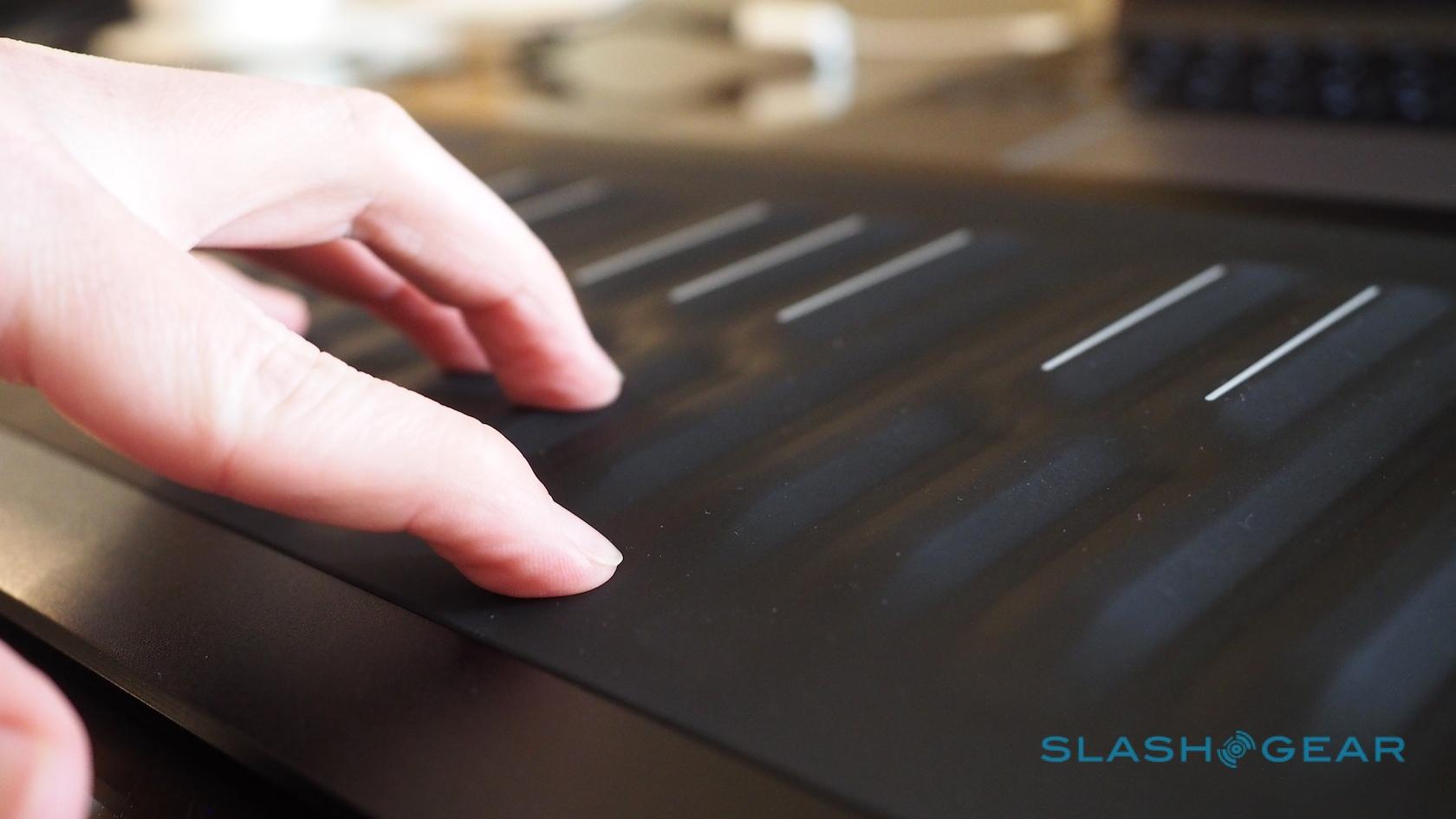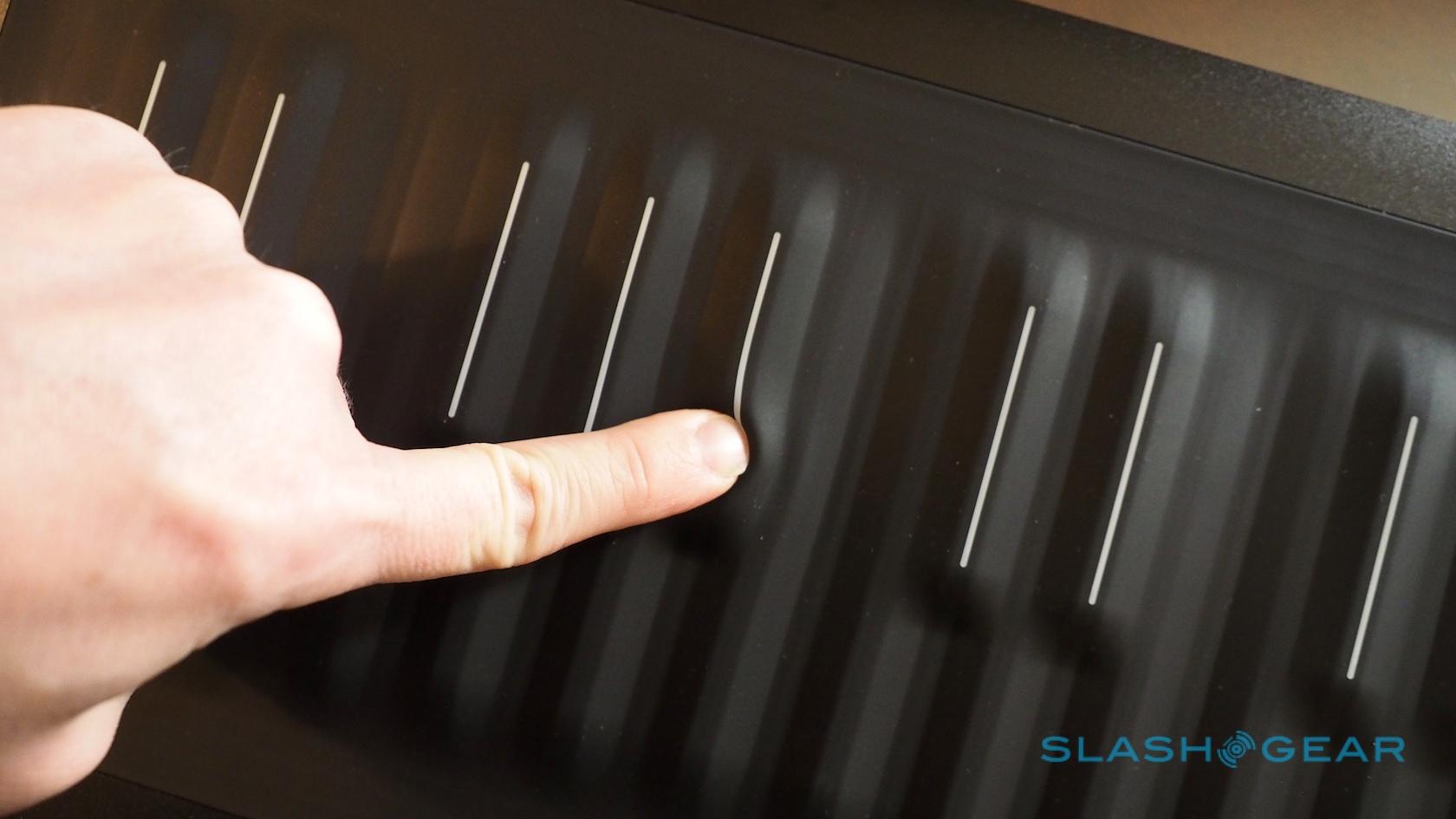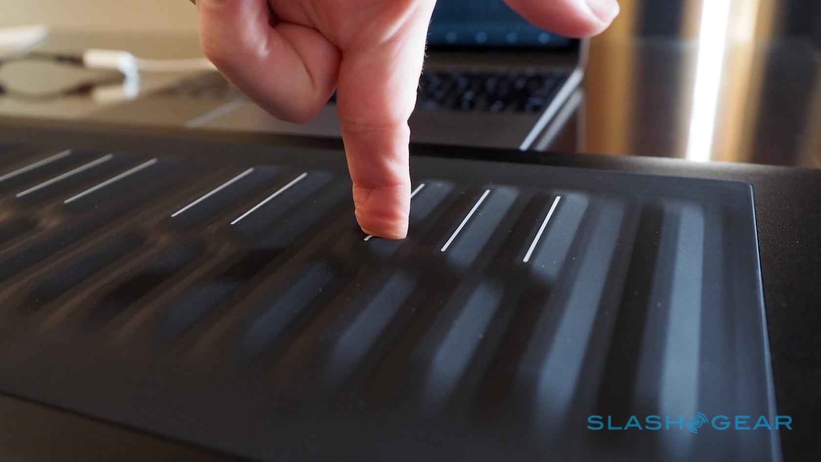 That surface is laced with pressure sensors which effectively turn the whole thing into a blend of different instruments: keyboard, theremin, strings, and more. While you can tap a key individually, you can also drag your finger across, apply more or less pressure to modulate the sound, and even take into account the vigor with which you lift your fingertip.