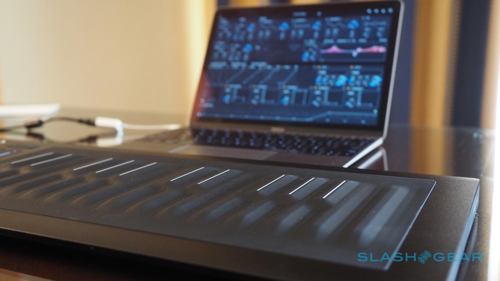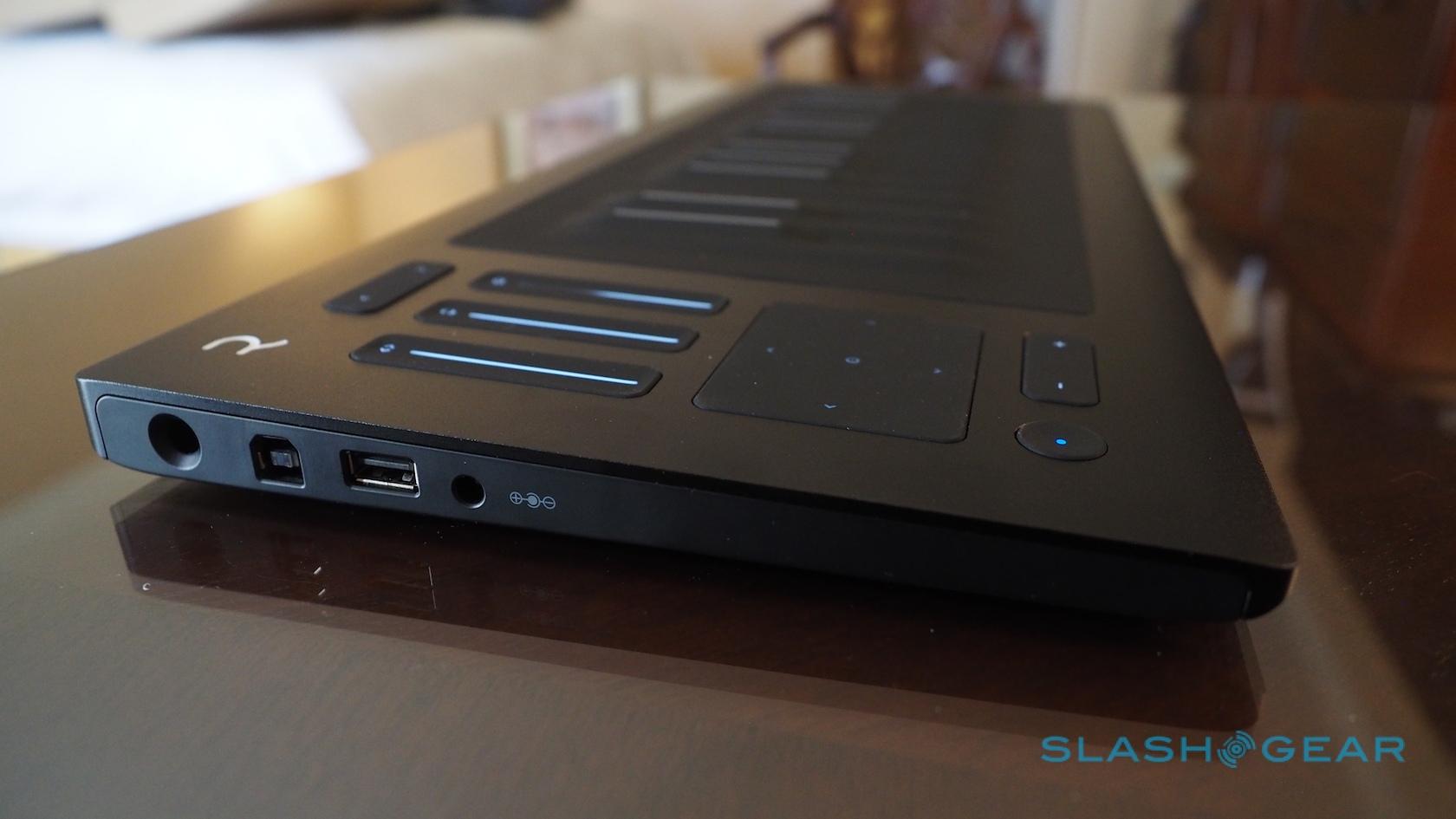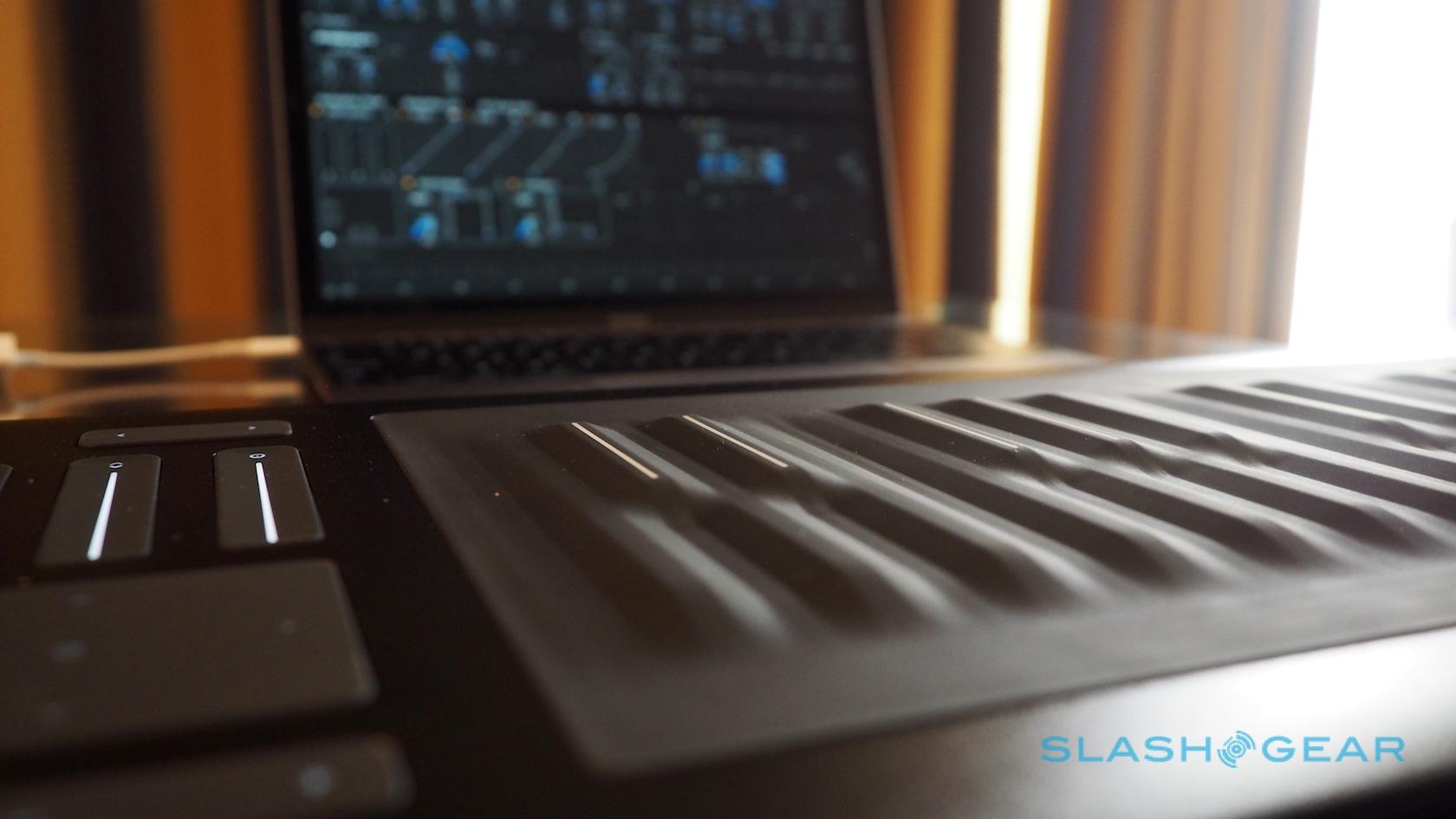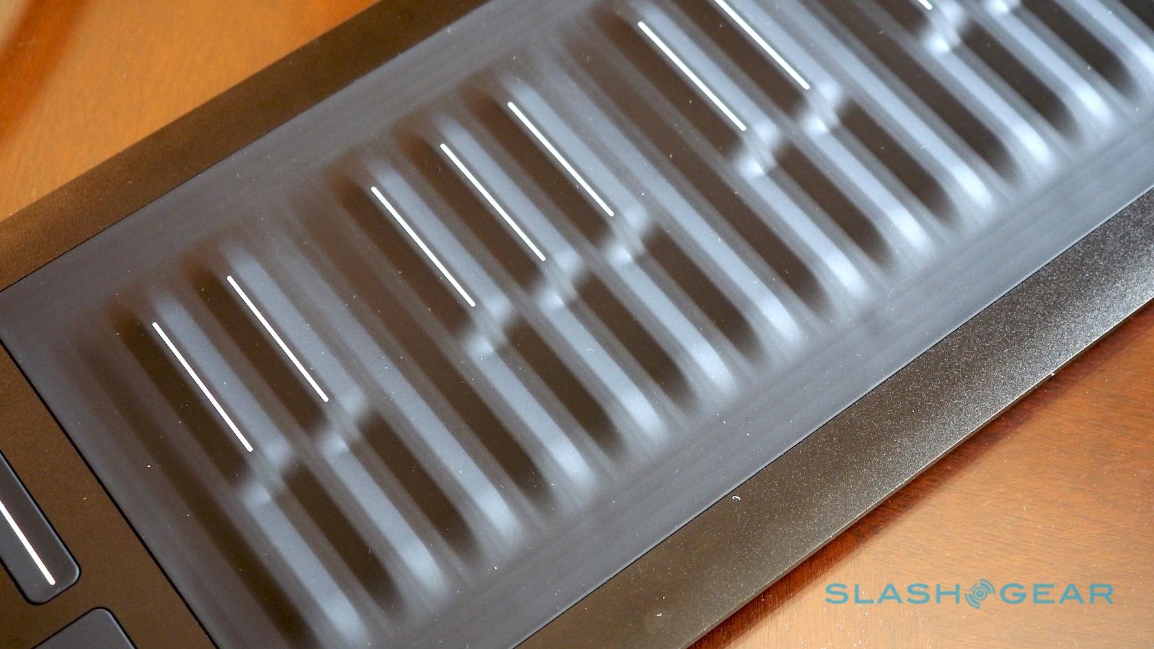 That surface is laced with pressure sensors which effectively turn the whole thing into a blend of different instruments: keyboard, theremin, strings, and more. While you can tap a key individually, you can also drag your finger across, apply more or less pressure to modulate the sound, and even take into account the vigor with which you lift your fingertip.