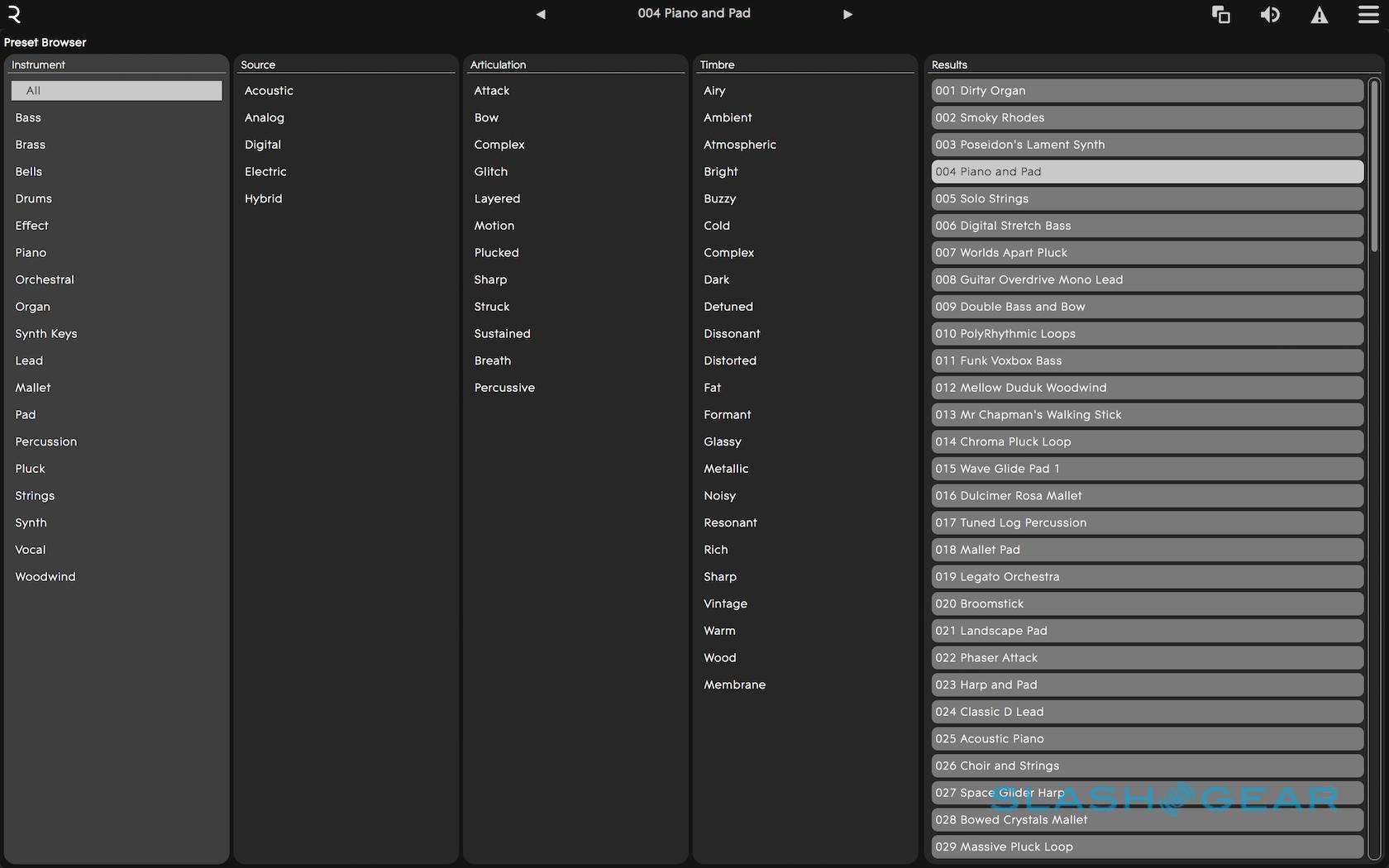 It looks a little complicated at first, but Equator is actually pretty straightforward. ROLI includes a few hundred different presets, organized not only into the usual categories like brass, organ, strings, and synth, but how they're articulated (sharp, sustained, bow, etc.) and their timbre (bright, dark, glassy, vintage, etc.) each with its own set of Strike, Press, Glide, Slide, and Lift settings shown on a little graph.