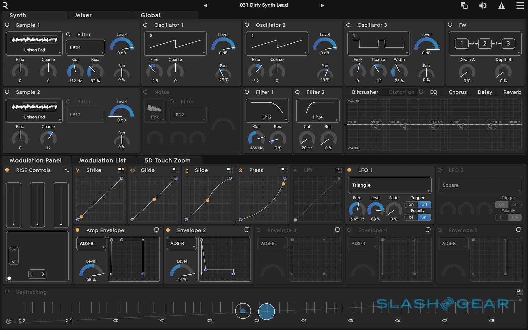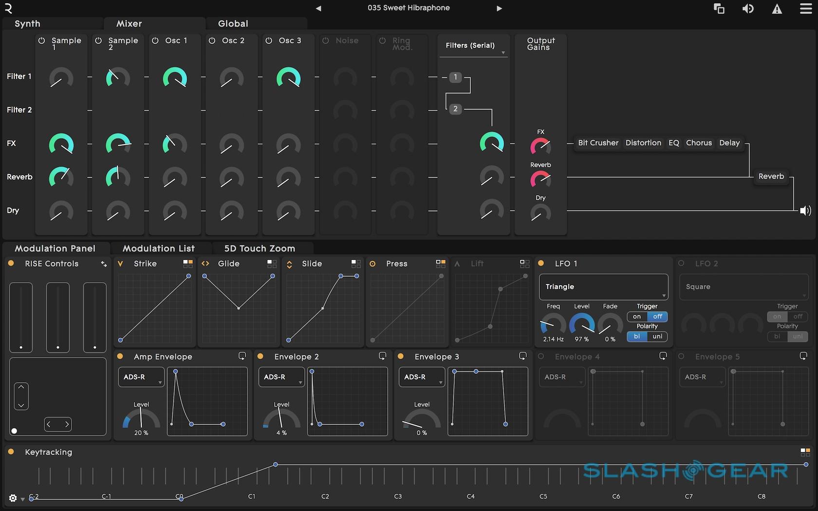 Slide is effectively the same thing, only flipped 90-degrees: the movement up and down each keywave. Finally, Lift is the speed with which you pull your finger off the keywave: a sudden lift might pluck a string, while a more languid one could let the note fade out more gently.