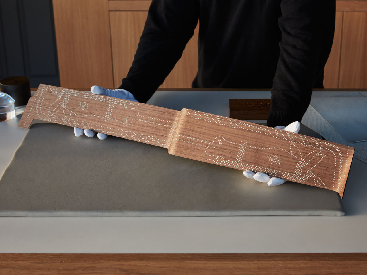 There's more. Phantom Oribe has a unique gallery featuring commissioned artwork based on the creations of French artist and illustrator Pierre Péron (1905–1988). The hand-painted Open Pore Royal Walnut piece has a glass cover like in an art gallery.