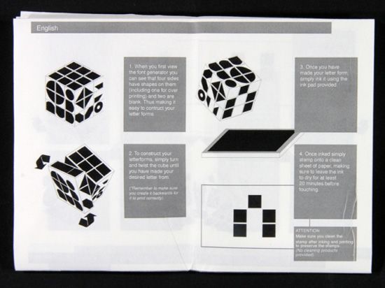 Inside the packaging there's the cube itself, an ink pad and the instructions, which show all of the different arrangements which can be used to make letters and numbers. It'll be time-consuming and laborious, of course, not to mention messy, but if you want to print your own posters with a minimum of tools then this is certainly one approach.