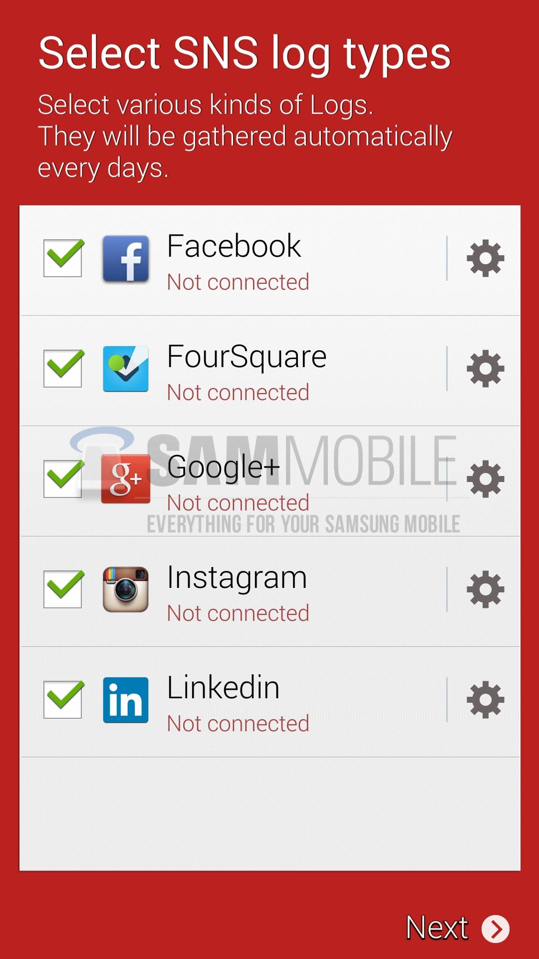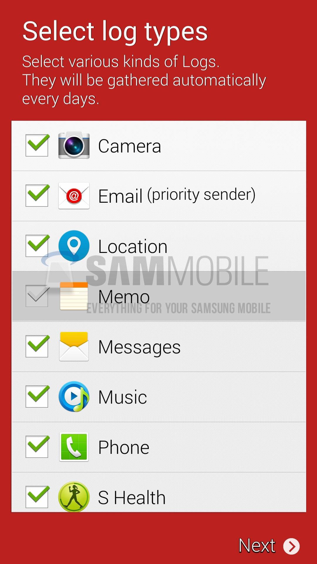 With the Samsung Life Times app you'll be able to log information about your music, phone calls, text messages, email, location, camera, and data inside your Samsung-based S Health app. Additionally it would appear that this app will be able to record SNS logs from Facebook, FourSquare, Google+, Instagram, and Linkedin as well.
