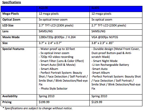 Anaheim, CA (February 20, 2010) – Samsung Electronics America, Inc., a market leader and award-winning innovator in consumer electronics, today added two 12 mega-pixel point and shoots to its digital camera lineup for 2010 – the durable SL605 and the waterproof AQ100. Thanks to their elements focused design, the AQ100 and the SL605 grant peace of mind and allow users to focus on taking the perfect shot, rather than worrying about damage to the camera. The AQ100 and the SL605 will be on display during PMA 2010, February 21-23, in the Samsung booth, #2227, in the Anaheim Convention Center.