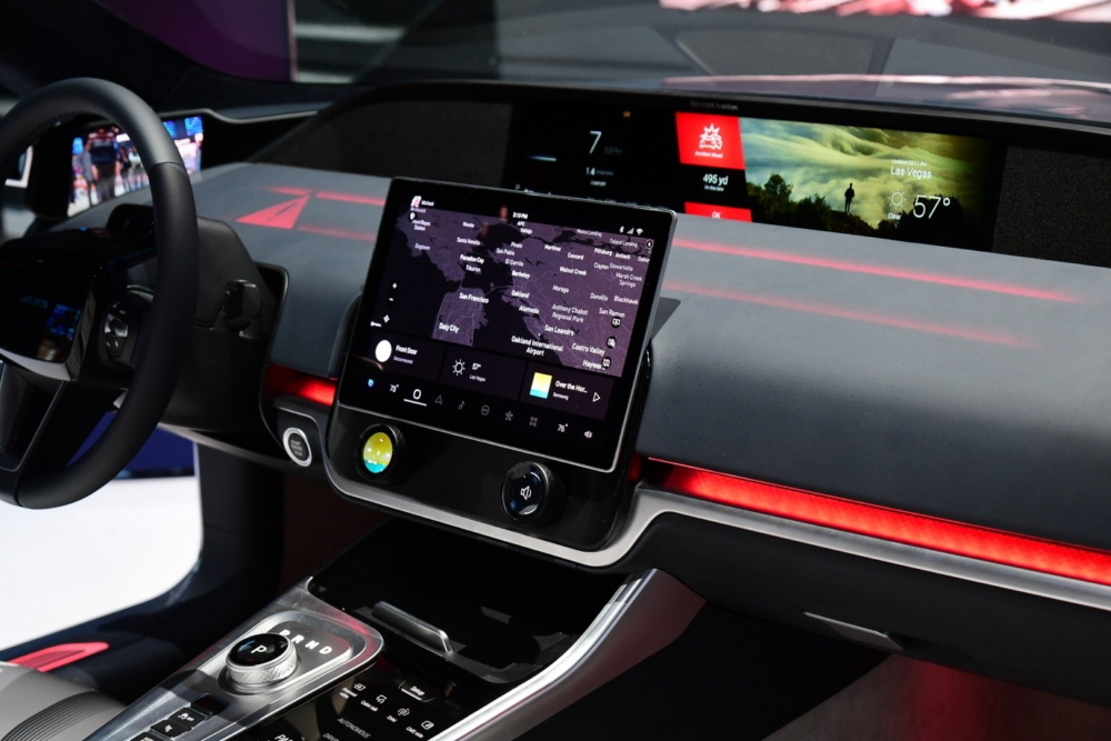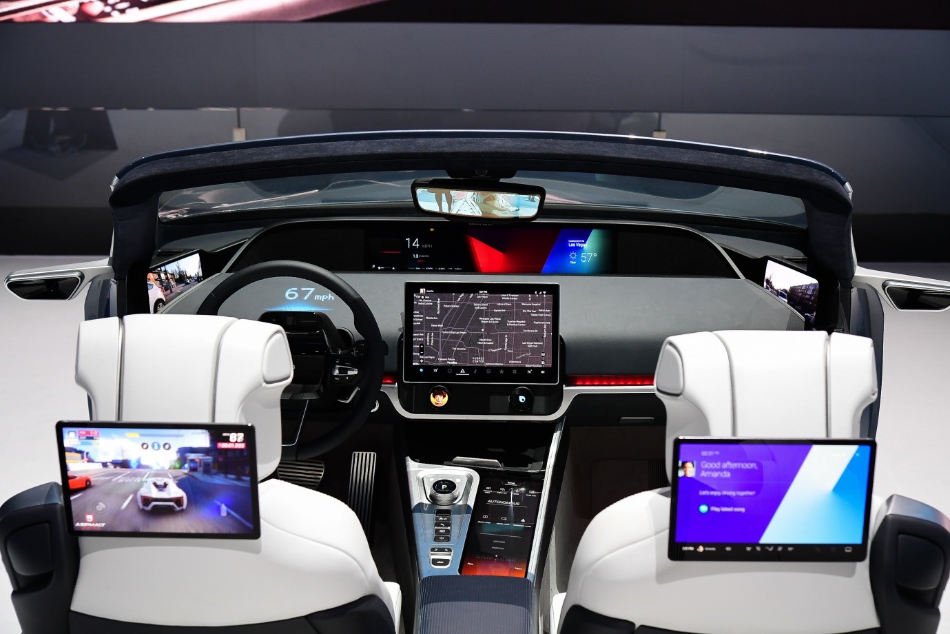 The eight displays consist of two side-view mirror replacements, a Front Display that shows navigation information at a safe eye level, a Dashboard Display integrated into the interior design that subtly delivers visual alerts and notices, and a central Console Display to access various functions of the car and the other displays. The Center Information display actually acts as the main car interface and has two physical knobs, both of which have their own displays, making a total of eight.