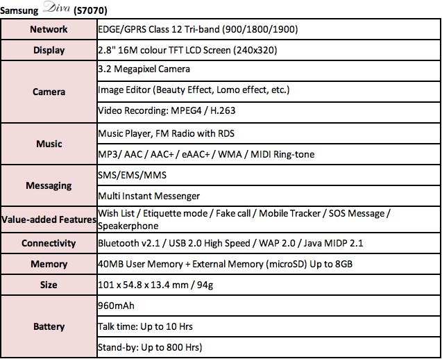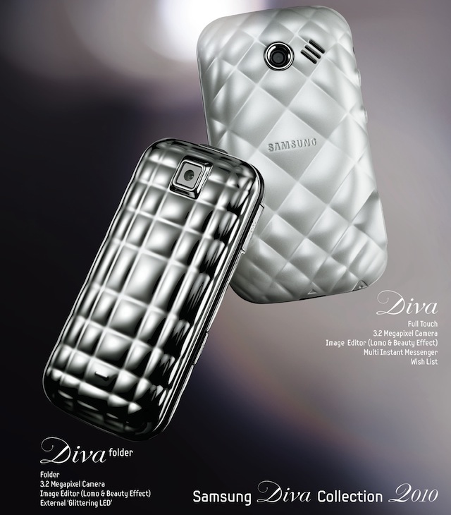 The launch of the Diva and the Diva folder marks Samsung's commitment to delivering stylish, fashionable and feature-rich phones for female mobile users. The Samsung Diva Collection 2010 will be launched in January 2010 in the UK, France, Germany and other European countries, followed by Southeastern Asia and China.