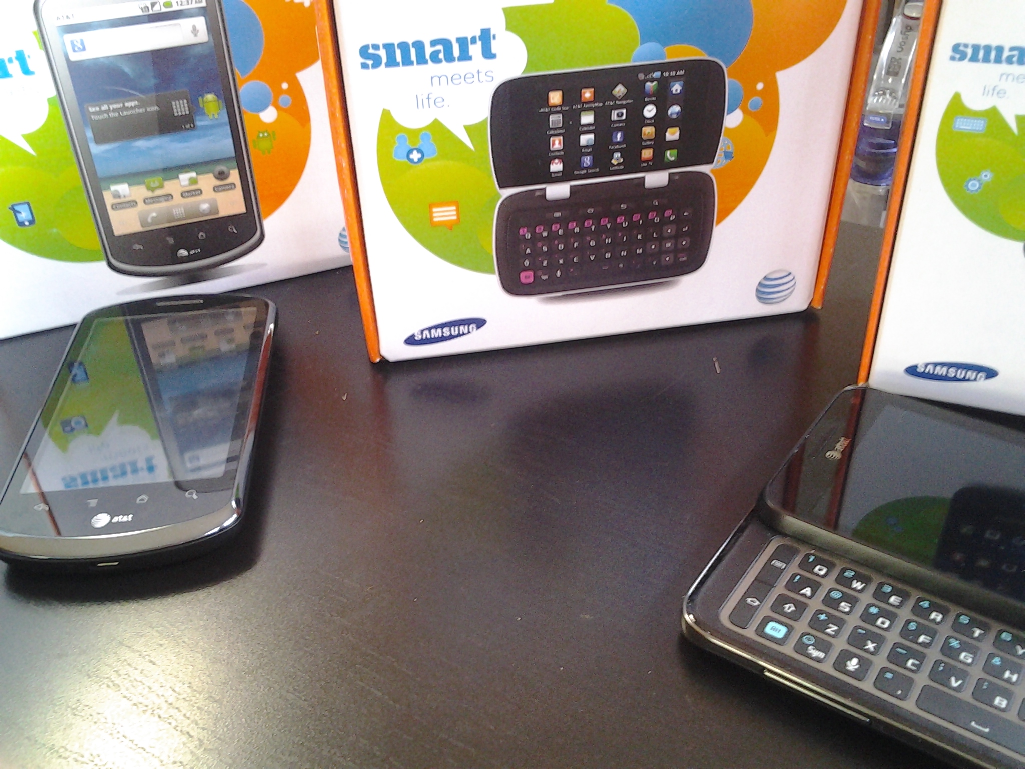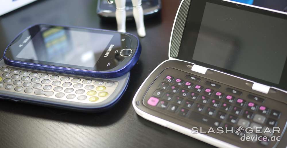 While this smartphone is far and away, not even in the same ballpark, basically not even the same sport as the top tier smartphones also made by Samsung such as the Galaxy S II or even the top of middle-tier devices like the Samsung Captivate Glide (also pictured below), it does hold some sway in its own lower level of internet-capable handsets. This device looks rather unique with its mostly white and black chassis and pink accents, and the double touch displays are certainly a nice touch.