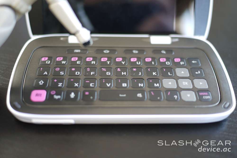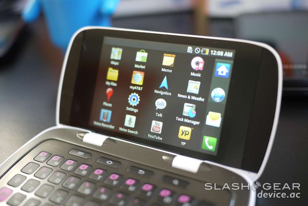 This little stormtrooper of the device has the oddest set of design cues, starting with the fact that it's got pink accents on the physical Android menu buttons. Very strange choice by Samsung if I do say so myself. There's a silvery plastic bar above the keys, Samsung and AT&T logos on the front, earpiece, and both proximity and light sensors. The device opens up like a clamshell the long way and sits at either a 135 or 180 degree angle when opened. Inside you'll find the second of two 320 x 480 pixel displays on one side, a full QWERTY keyboard on the other side with what you'll find is the reason for the pink accents on the outside: pink accents on the inside.