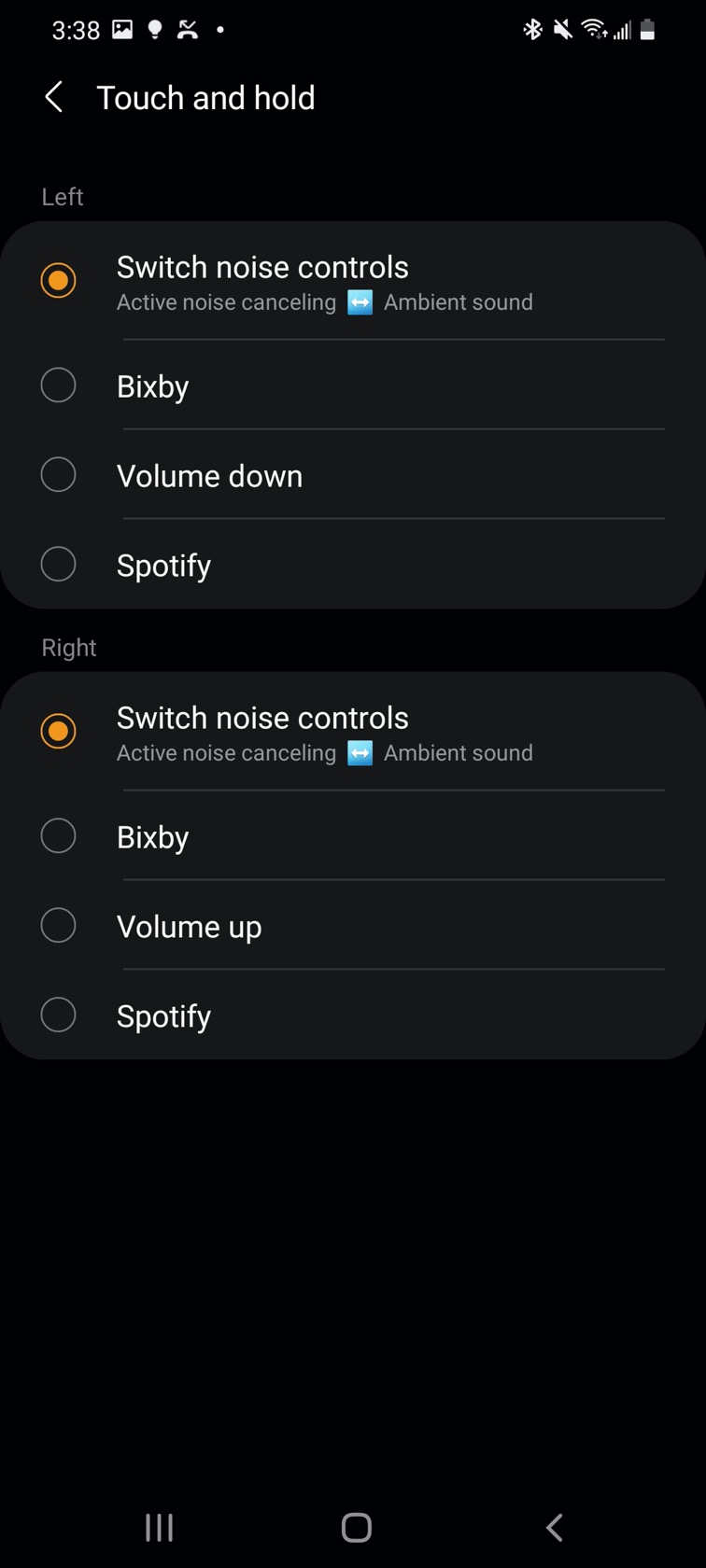 The outer touch pads can be set to different shortcuts on the left and right earbud for touch-and-hold: to switch between ANC modes, trigger Bixby, and launch Spotify, or have the volume lower with the left earbud or raise with the right. Alternatively you can rouse Bixby hands-free, with a voice command, but sadly there's no support for doing the same for the Google Assistant or Siri, or indeed triggering either from the earbuds but touch.