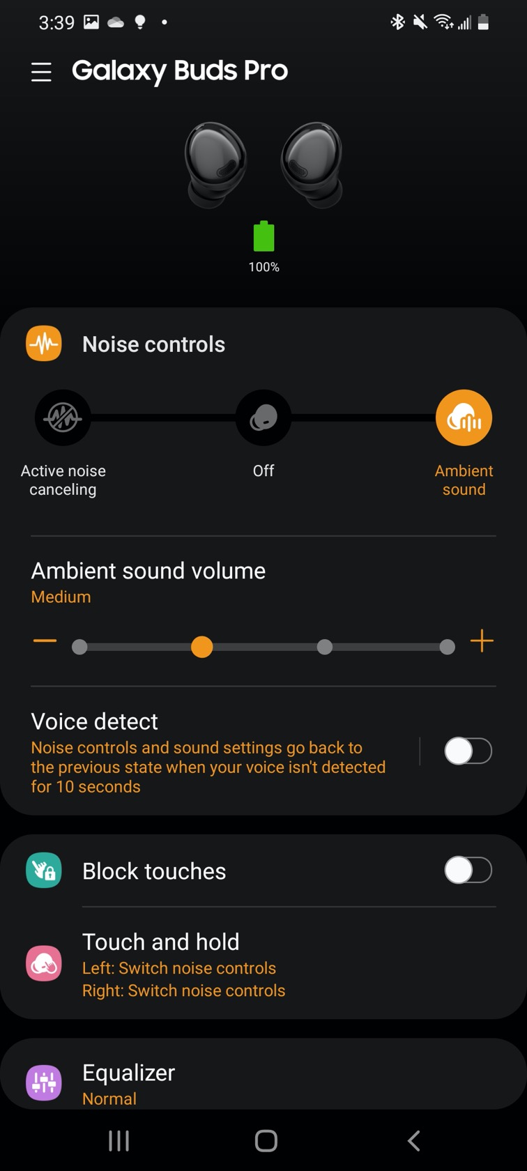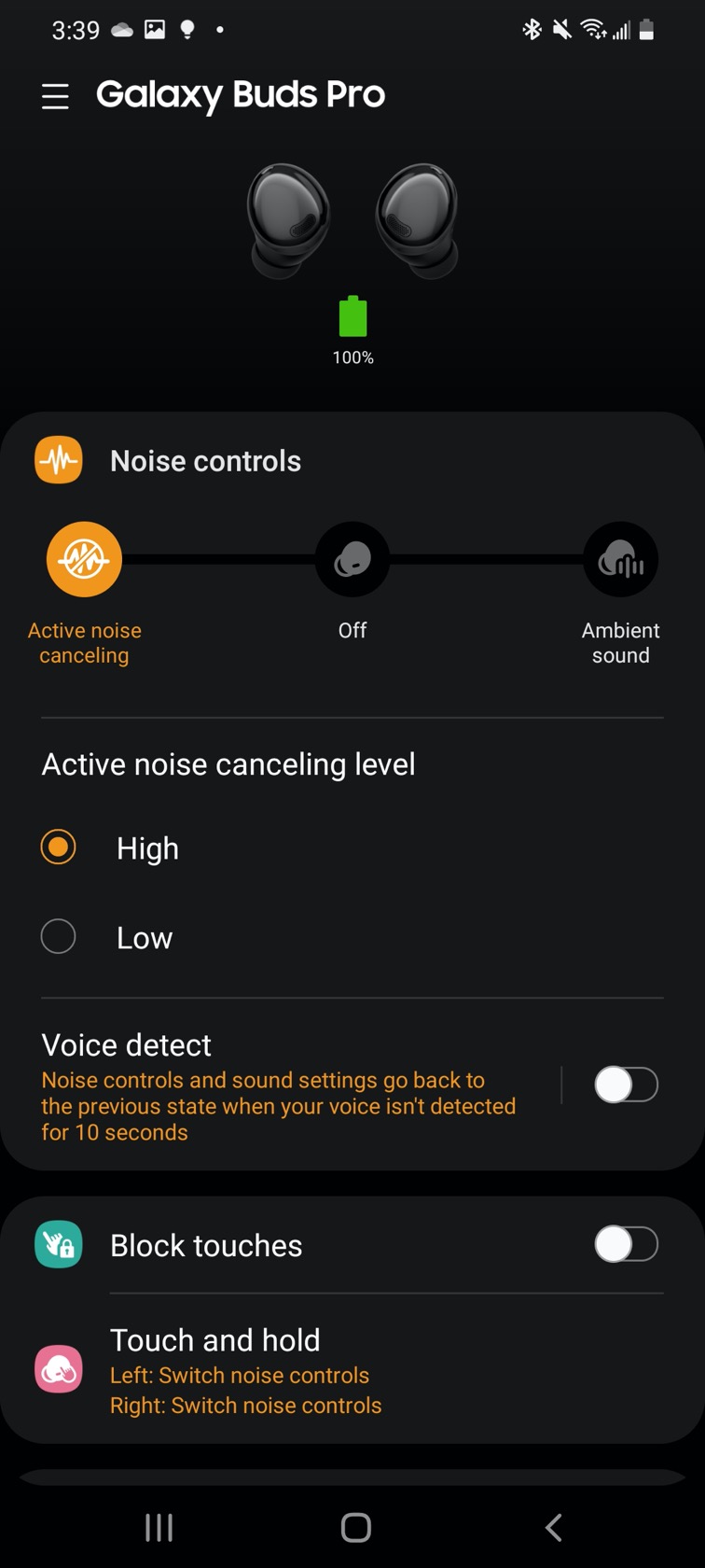 Voice detect is a little less useful, in my experience. The idea is straightforward: temporarily switch from ANC to Ambient Sound mode when the Galaxy Buds Pro hear you talking, so that you can speak to a barista, chat with a spouse, or try to plead with your cat that she's already had three lunches and isn't getting a fourth. After 5, 10, or 15 seconds of no speaking, the earbuds automatically switch back to the full ANC mode.