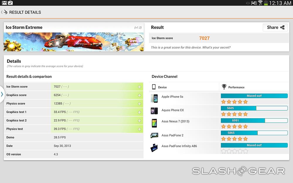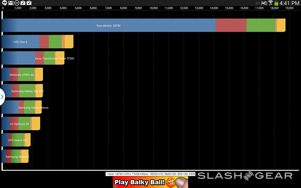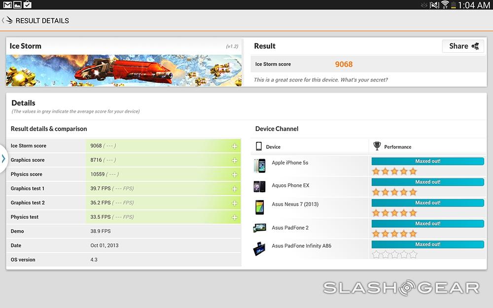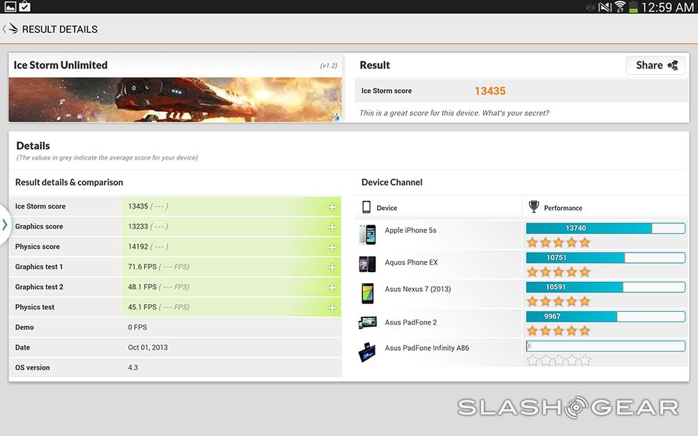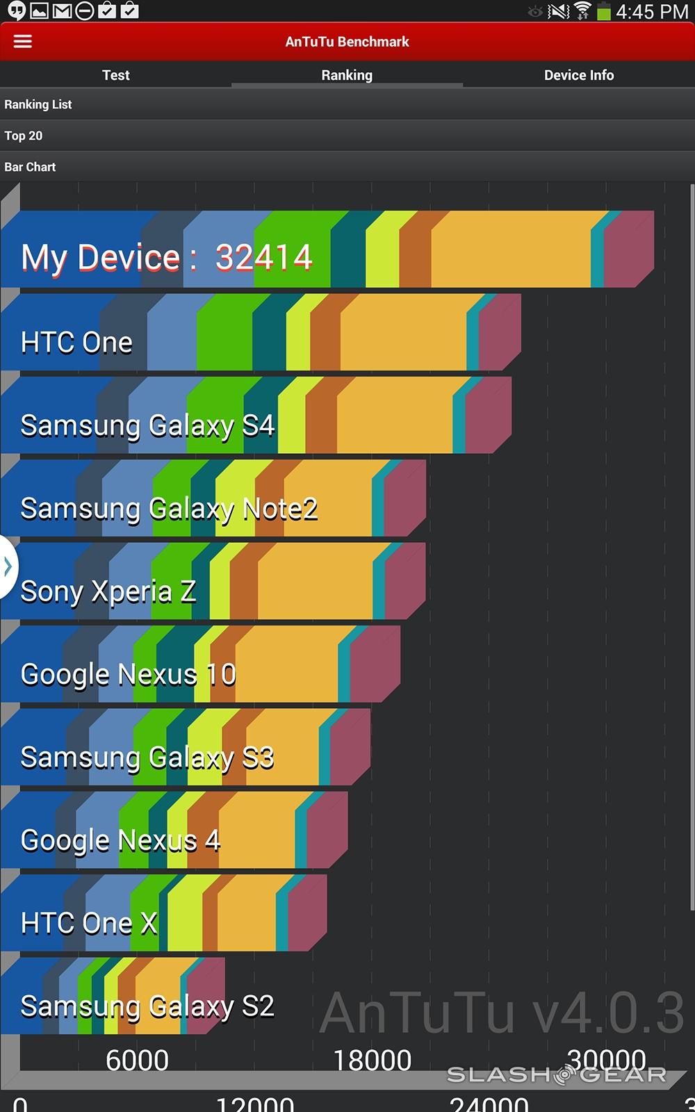 With the Samsung Exynos Octa processor clocked in at 1.9GHz per core under the hood of this machine, you'll find one of the most powerful tablets of this size out in the wild today. While this device is aimed squarely at entertainment and the high-powered S Pen actions described earlier in this article, the Exynos processor here still kicks out the power in standardized benchmark tests.