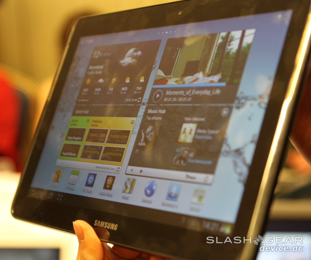 Both Adobe Photoshop Touch and Adobe Ideas apps are pre-installed on this device, your ability to use various tools, effects, layers, and full pen pressure sensitivity now at your fingertips. Draw with vectors, utilize layers, and access the full personal pen Photoshop experience all in one device. The 10.1 Note has Samsung Hub services as well as S Pen Apps as the original Galaxy Note does, S Suggest, Readers Hub, Video Hub, Game Hub, Music Hub, and Chat On amongst them. S Pen Apps include such classics as Slice It! and Comic Book as well as Catch Notes, Touchnote, and Hello Crayon. Each of these apps will be available inside Samsung Apps for the release of the device.