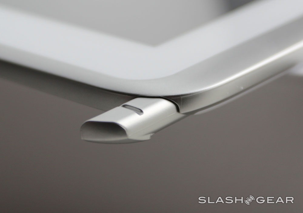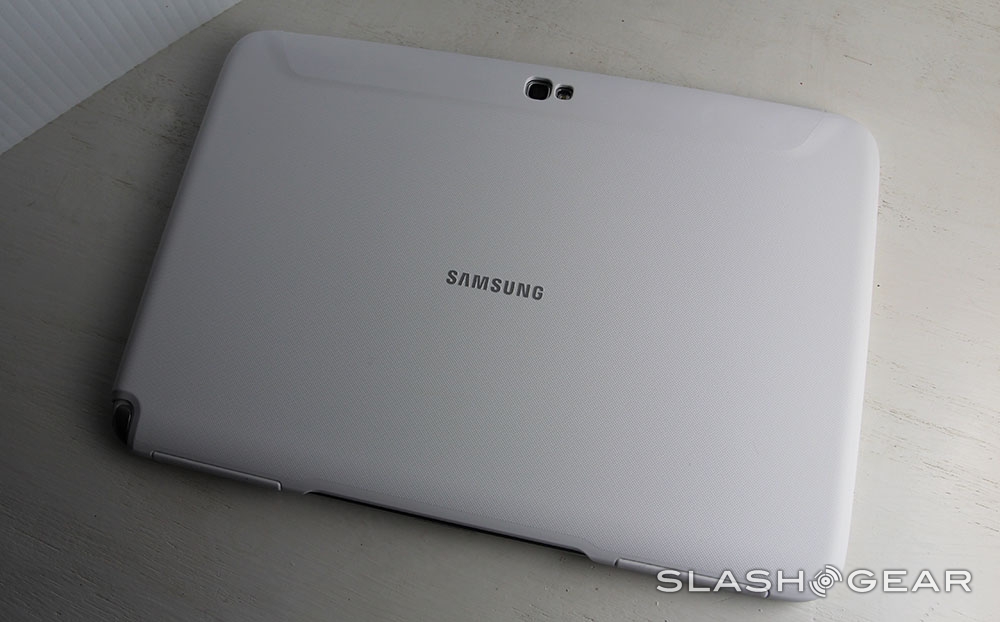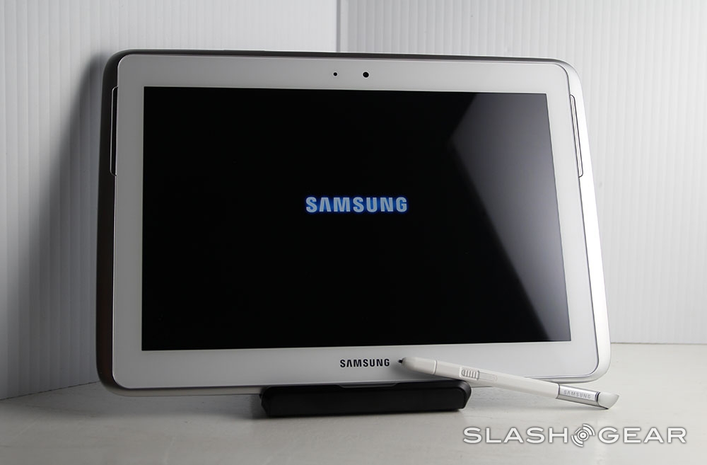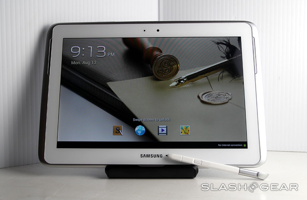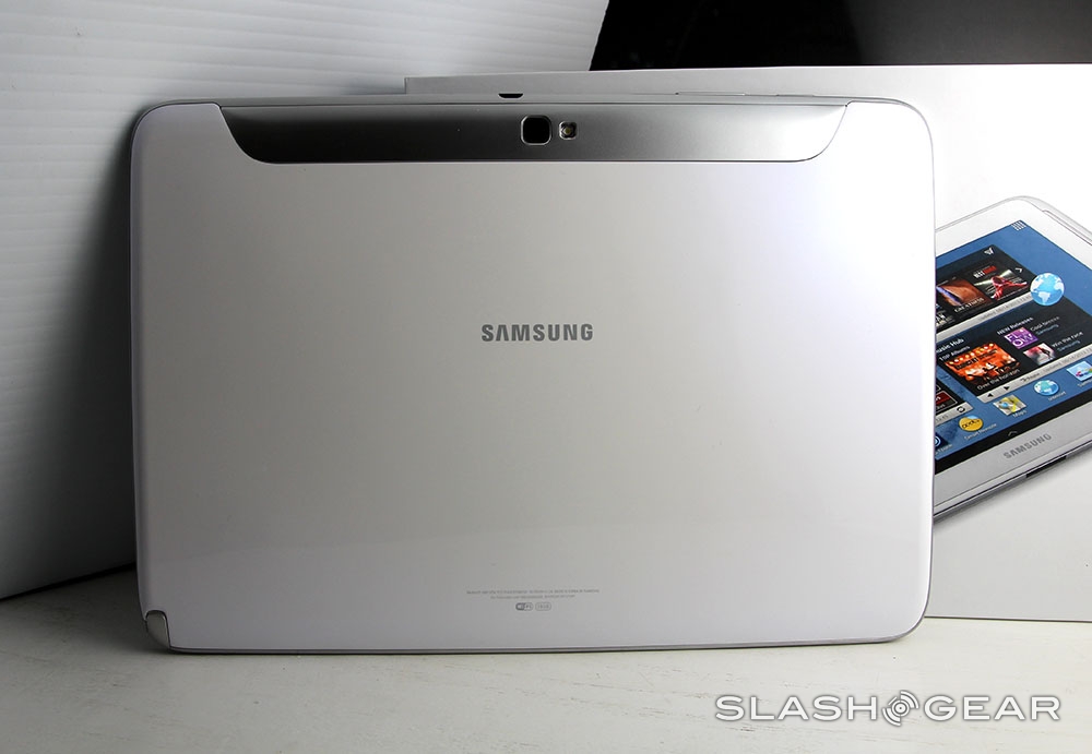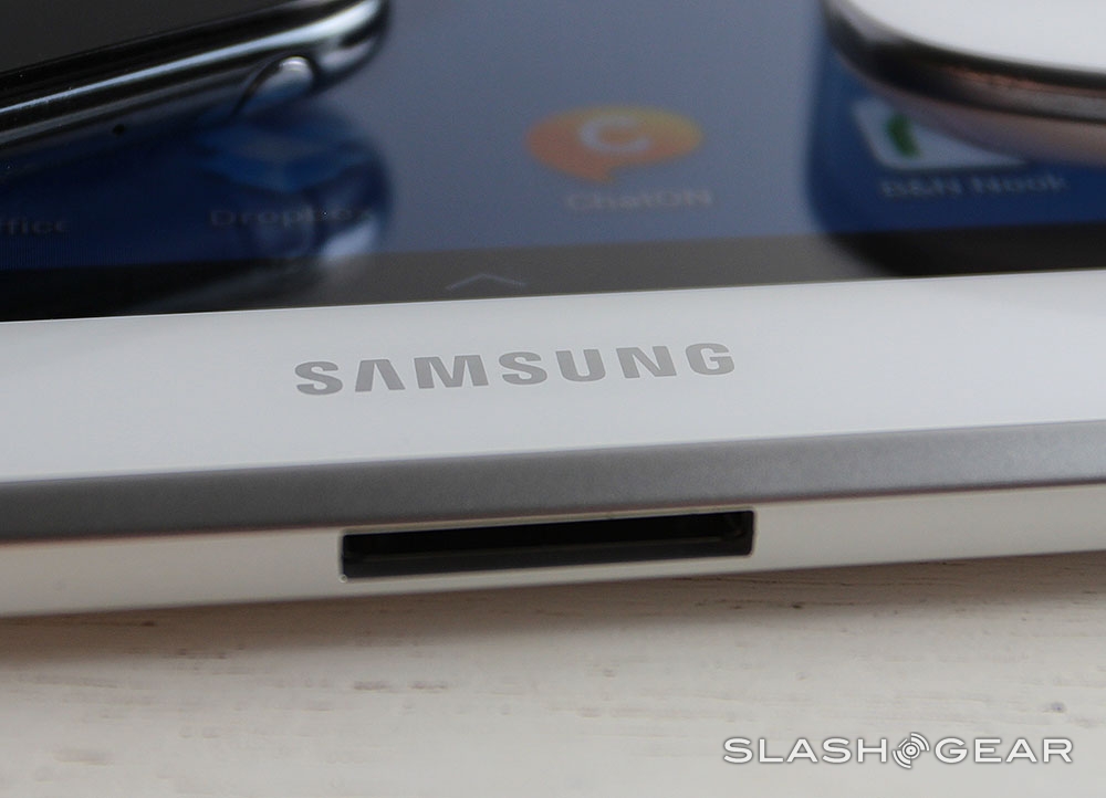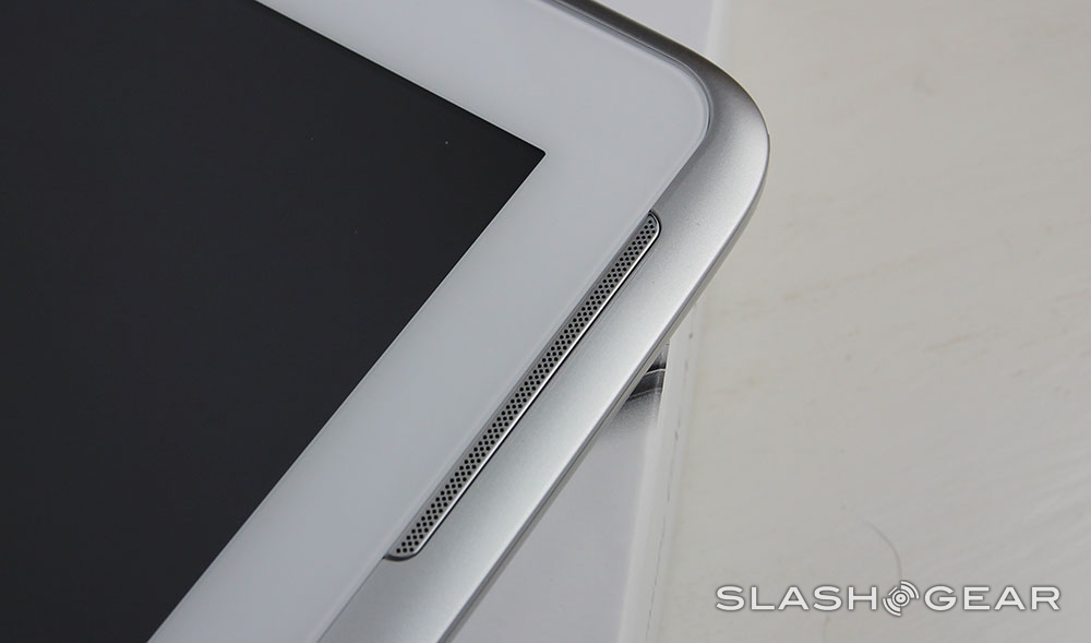 The tablet is relatively light, essentially as thin as it counterparts in the Galaxy Note and the Galaxy S III lineups, and feels really nice to hold. The glass up front sits a bit lower than the silver rim around the entire device, and the uniqueness of the tablet is clear – this is no iPad. We wont be comparing this device to the most popular tablet on the planet right here and now though, check the SlashGear main news feed for more device war action in the near future.