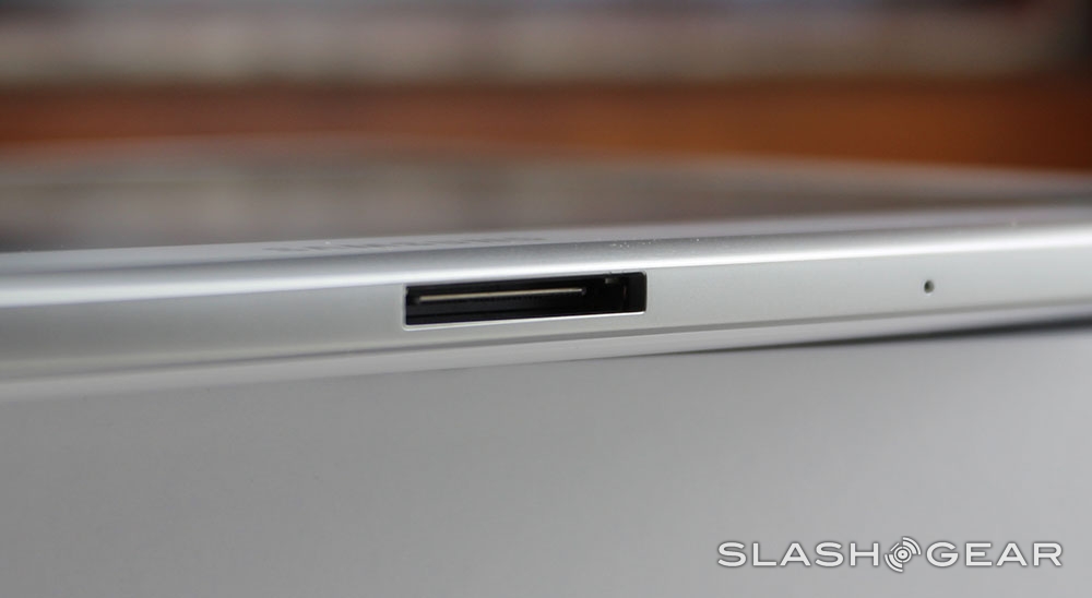 Up top you've got a power/sleep/lock button, a volume up/down button, and a microSD card slot. You've also got an IR-Blaster just like the Galaxy Tab 2 has so you can use your Peel app to change the channel on your television – and get a guide for channel browsing if your cable provider is able to be found by Samsung.