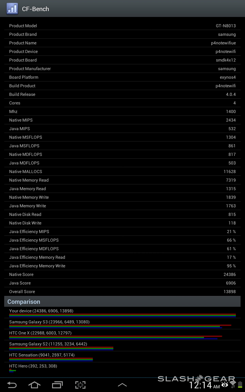 The back and sides are made of some high-quality plastic and there's a pleasant feel to the whole device. Samsung has put some time into the tactile nature of the device for certain, and here they've got a unique device that's set to carve it's own path in the tablet universe. As for how well the device does in the standard benchmarks we generally run, it's a beast and a half. For Antutu we're seeing 12200+ on average. In CF-Bench we've got 24386 for Native, 6906 for Java, and 13898 for overall score. That's off the charts. Quadrant Standard benchmark has this tablet ringing in at 13041 for CPU, 4469 memory, 5158 I/O, 1000 2D, and 2459 3D.