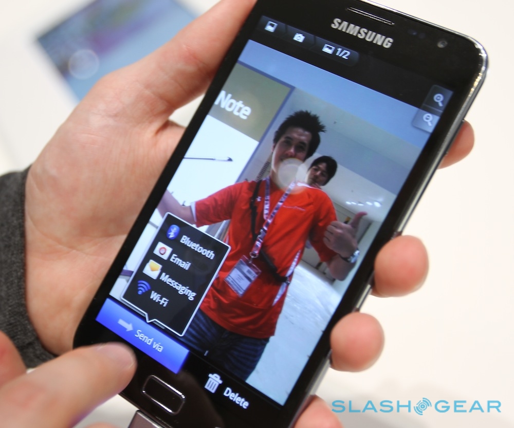 They range from handwriting recognition – which did a mixed job with cursive, but handled individual letters well; it's worth remembering that Samsung is still finalizing the software – to clipping, sketching and annotating. Hold down the pen button and double-tap the display and you take a screenshot, which you can then mark up or clip in regular and freehand shapes. In the messaging apps, you can draw maps or handwrite replies rather than tap them out on the on-screen keyboard (which itself, thanks to the relative broadness for a phone, is well-spaced and easy to use), while you can also write into emails. The Samsung S Memo app supports photo, voice, text, handwriting and drawing capture, and is added as a regular Android "Share" option to make adding content, like photos you've just snapped with the 8-megapixel camera, straightforward. A virtual whiteboard app, intended to be released through Samsung's own appstore, will allow two Galaxy Note users to collaborate remotely on a single shared workspace.