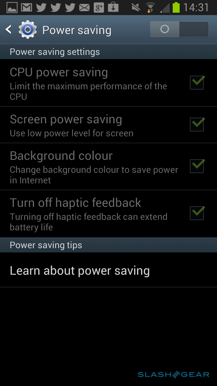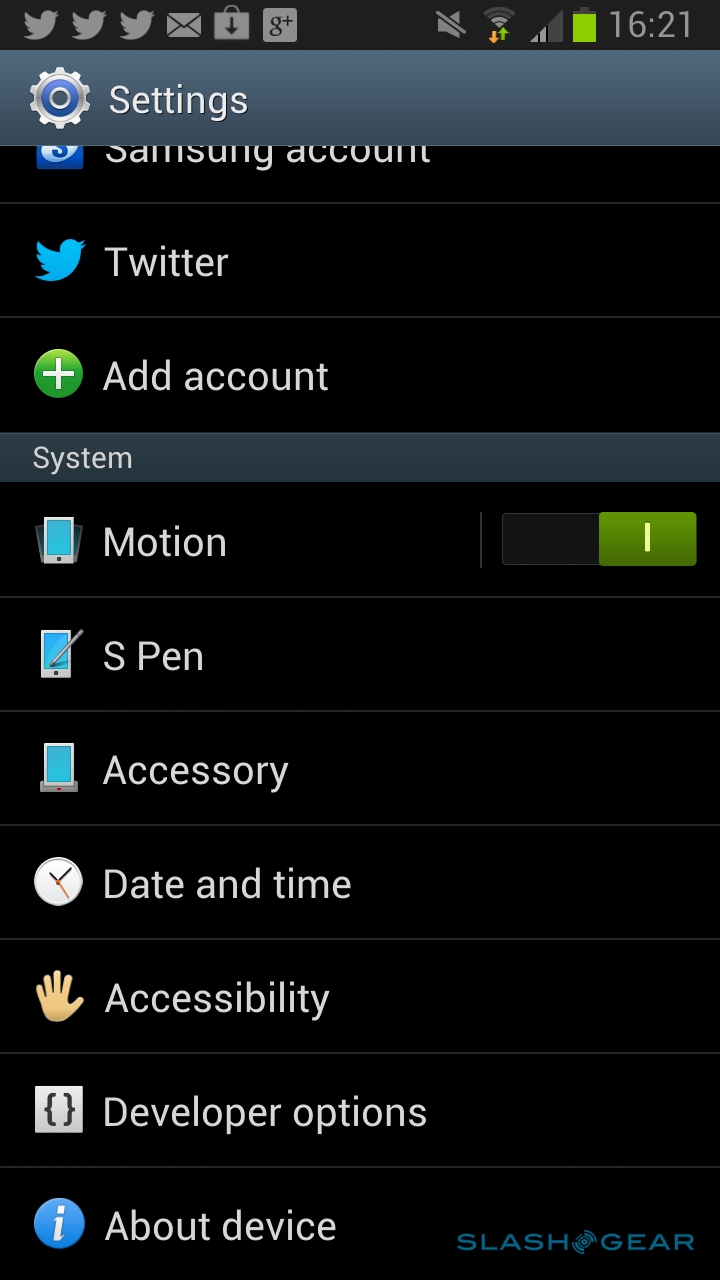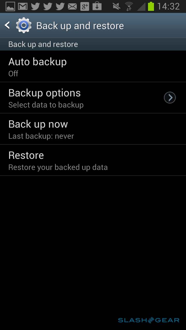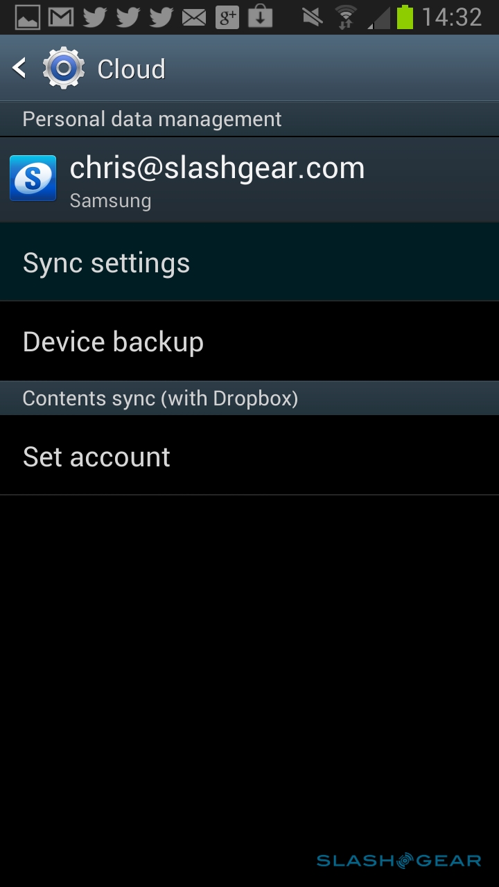 In addition to Google's own Android backup, Samsung has added in support for its Cloud service. Register for a free Samsung account, and you can sync your calendar, contacts, internet history, and S Note data; you can also do device backups, of logs, SMS and MMS messaging, and wallpapers, either on-demand or according to a regular schedule. If you'd rather not use Samsung's cloud, there's baked-in support for Dropbox instead.