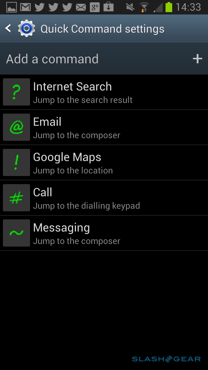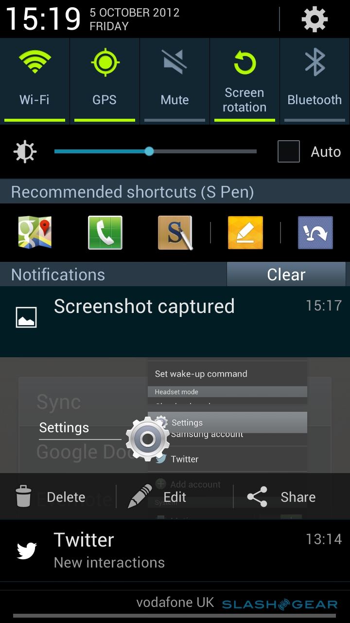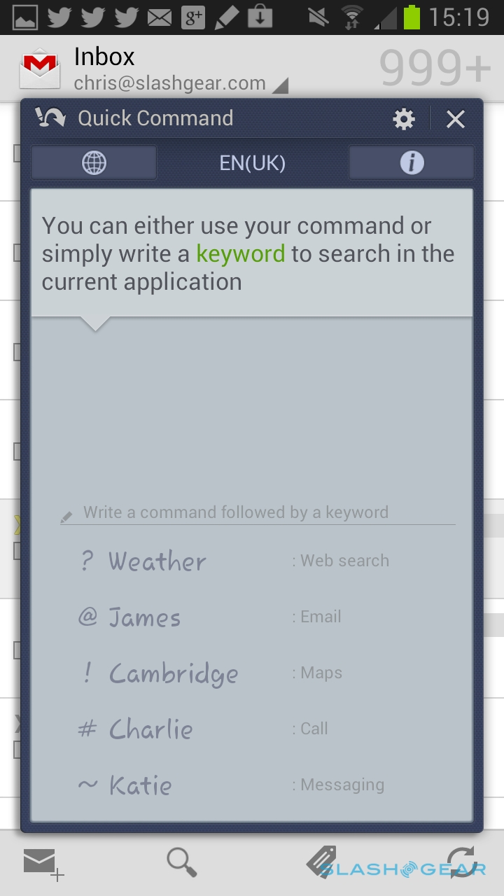 New is Quick Command, summoned by holding down the barrel button and swiping up the display; it works no matter what app you're currently in, and brings up a floating dialog for pen-triggered shortcuts. Write a question mark, for instance, followed by "weather" and you'll get a browser search for the current weather; write "@" and a name, and a new email will open up with suggestions as to the recipient from your contacts (if you've only one contact with that name, they'll automatically be selected). Somewhat annoyingly, given the excellent Gmail app is one of the boons of Android, Quick Command's email composer only works with the customized regular email application. Samsung preconfigures a number of shortcuts, but you can also train it to recognize your own.