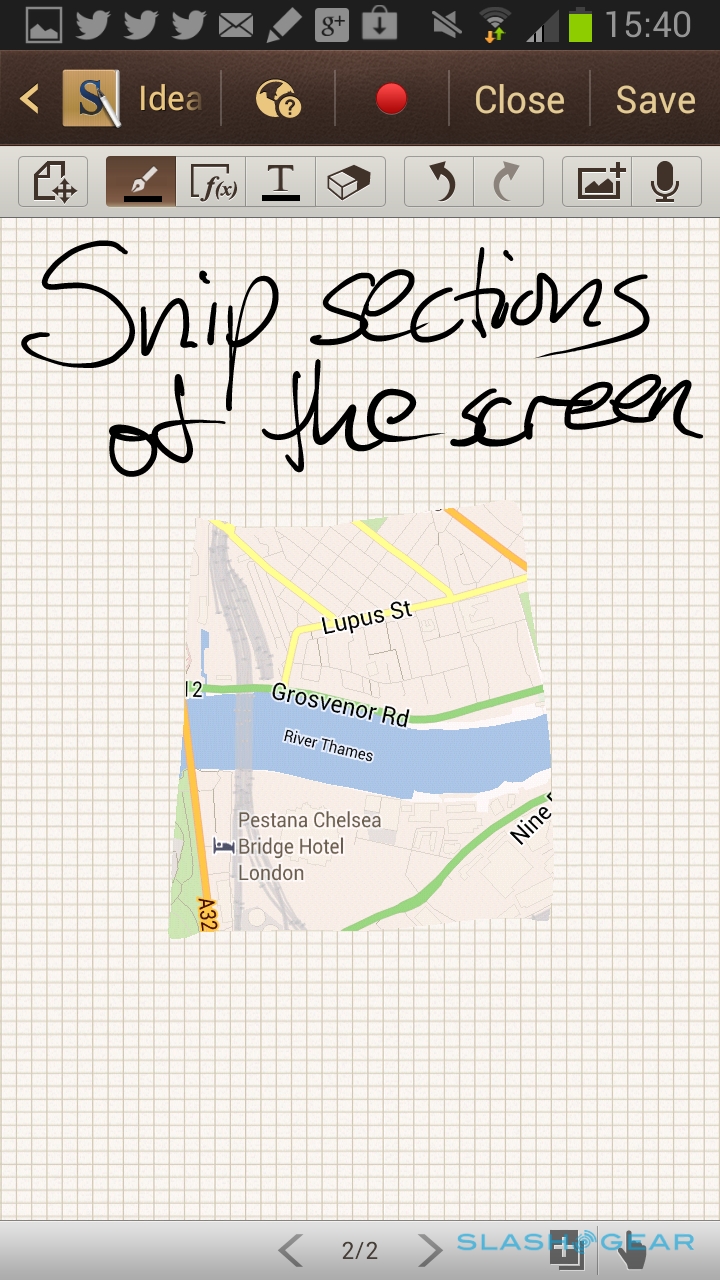 Samsung's stylus can also be used to grab sections of the display as screenshots. There's support for the hand-side-swipe to grab a full screenshot, just as on the Galaxy S III, but you can also hold down the barrel button of the pen and snip out a shape – as basic as a circle or square, or something more finicky – and then annotate it or add it to a notebook. S Note has various preset shapes and clipart, too, and you can add voice recordings, sections of maps, photos, video, and other attachments to each note.
