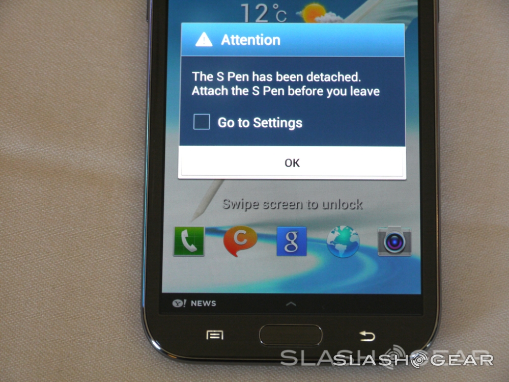 This device once again has a slot inside it where your S-Pen can rest while it's in your pocket. As an added bonus, it's got a special alert that notifies you if you're leaving the area without your pen in its dock, this a great feature for those that are forgetful. This S-Pen and the technology that surrounds it is able to detect interaction between the pen and the display even before they physically touch, shown here in the hands-on video at right about the 1 minute mark.