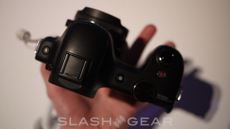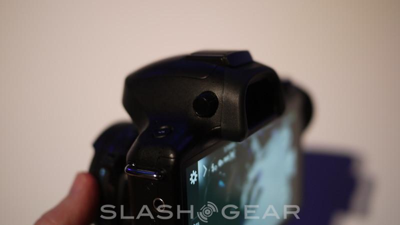 Up top you've also got a built-in pop-up flash as well as a rubbery cover for this device's viewfinder. Of course you'll be able to use this machine's massive display on its back to see what you need to see, but lovers of the classic fashion can still rejoice.