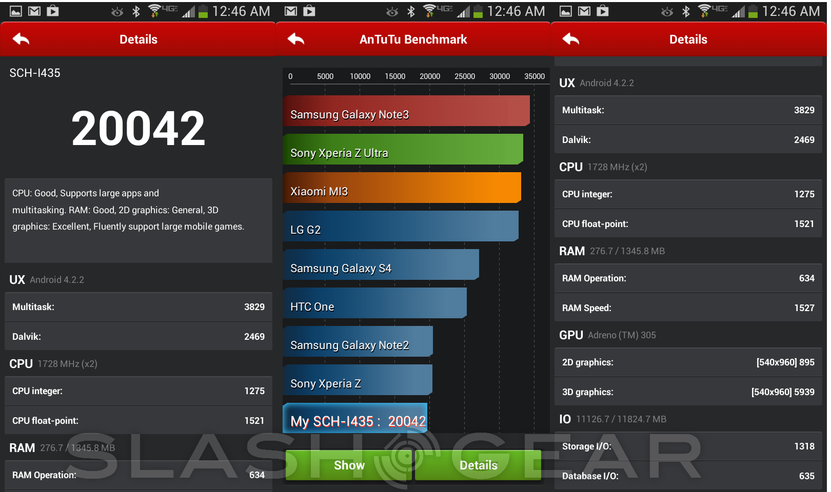 We ran the well known AnTuTu benchmark on the Mini to see how it fared compared to some of its larger brethren, and as you can see from the screenshot below, it held up fairly well, though is obviously below the rank of its larger sibling, the GALAXY S 4, as well other notable handsets. As far as benchmarks go, it scored only a touch beneath Sony's Xperia Z and the Galaxy Note 2, so anyone familiar with those handsets will find — performance-wise — the Mini to be essentially identical in performance. The graphics component of the benchmarks, in particular, stood out as excellent, while the memory and processor came in a bit lower at "good".