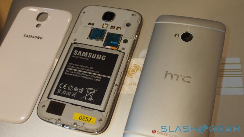 And here's one of the biggest key differentiators between the two of these devices: the Samsung GALAXY S 4 has a removable, replaceable battery as well as a microSD expansion slot. The HTC One has neither.