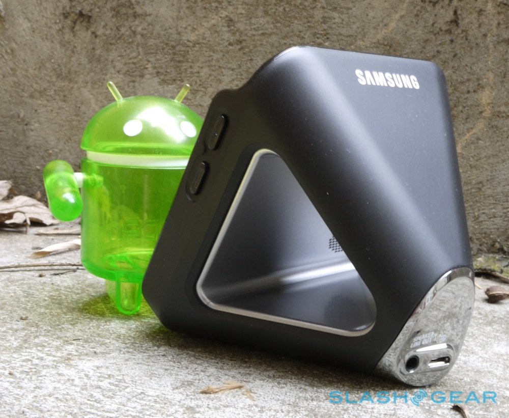 Docking stations for mobile gadgets vary in complexity from simple stands to full multimedia stations with various audio and video outputs, charging, and pass-through sync. Samsung's official Desktop Dock for the Galaxy S II falls somewhere in-between, an attractive black plastic block shaped like a pyramid toppled backward, with a cut-away middle section. The phone drops in at the front and there are volume buttons on the right edge along with – in a chrome-finish end plate – a 3.5mm audio output port and a microUSB charging port on the back.