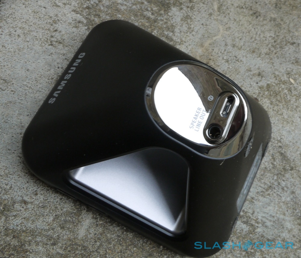 In the cutaway section there's what looks at first glance to be a speaker grille, but in fact is the outlet for a sound pipe. In the cradle, behind the GSII's own rear speaker, there's a cutaway that channels the phone's audio through and passively amplifies it along the way. It works surprisingly well, though you get better results – in stereo – by plugging in a set of external speakers into the dock's audio-out socket.