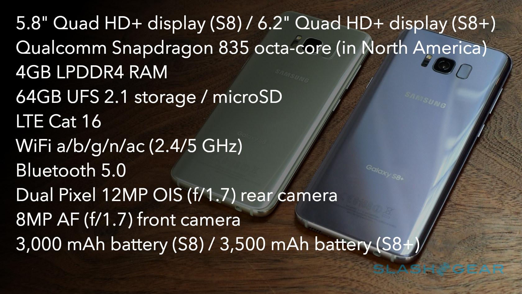 The S8 has a 5.8-inch Super AMOLED screen, while the S8+ steps that up to 6.2-inches. Both curve gently around both sides, framed with a narrow metal bezel. The same camera – with new software – from the ill-fated Note 7 is on the back, and a new, higher-resolution front-facing camera is on the front. Android 7.0 runs on either Samsung's own octa-core Exynos or Qualcomm's Snapdragon 835.