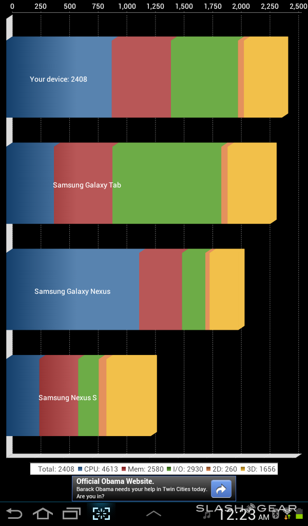 You've got an IR blaster on the side of this device to connect to your Samsung Smart TV, and a microSD card slot to expand your memory by 32GB. The device runs Android 4.0 Ice Cream Sandwich which means you're up on the newest version of Google's mobile operating system and it all runs rather slick. Have a peek at Quadrant Standard benchmark here to get an idea of what you're working with on this 7-inch dual-core Android device: