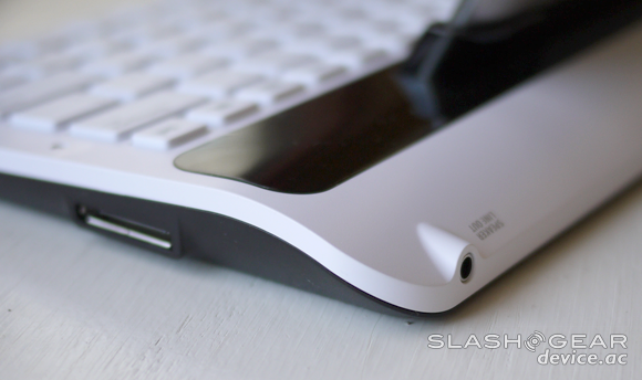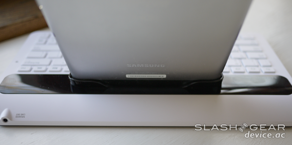 There are three ports on this device, and one of them is right up top where the tablet connects to the keyboard. When you connect to the tablet, it is, again, an instant connection with no configuration, but just as important is this: it's not to loose and its not too snug. Samsung has had some experience with making docks for their billion different sized smart devices over the past couple of years – and it shows here in this excellent glove of a device.