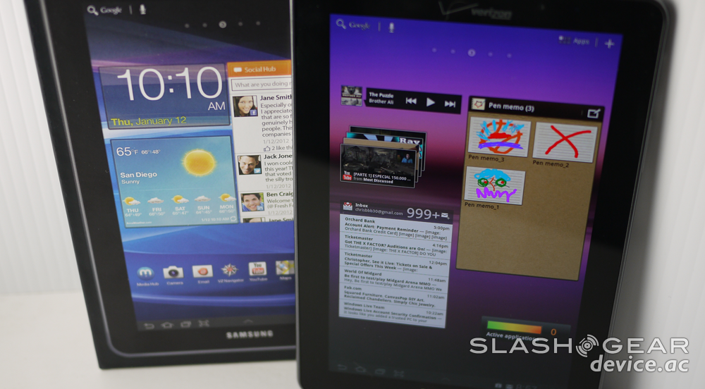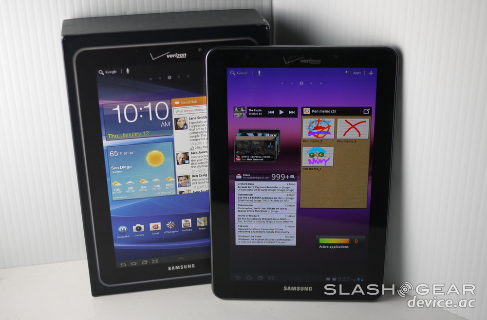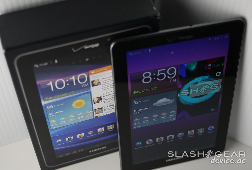 Inside you'll find the rapidly aging Android 3.x Honeycomb, complete with Samsung's own TouchWiz UX on top. This is the same TouchWiz we were first introduced to back at CTIA in the Spring of 2011, and it's looking as good as it's ever looked here in this slightly modified version over its 10.1-inch optimized cousin.