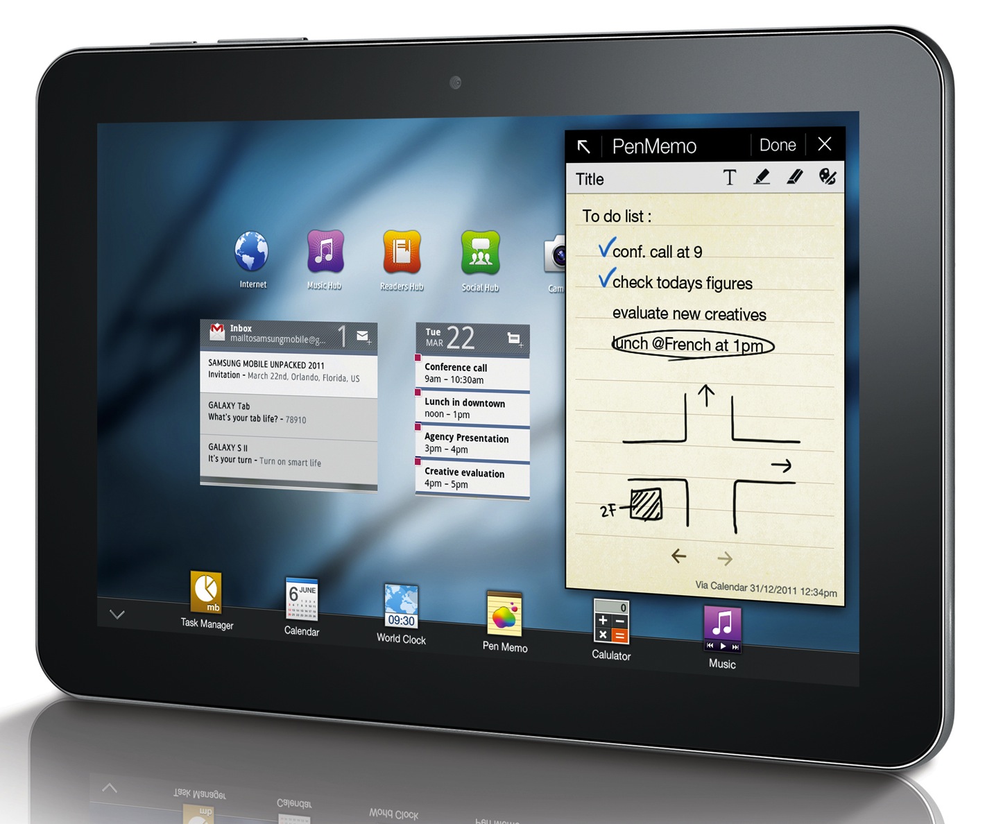 The GALAXY Tab 10.1 and 8.9 are pre-loaded with Readers Hub and Music Hub giving consumers instant access to more than 2.2 million books, 2,000 newspaper (49 languages), 2,300 magazines (22 languages), and 13 million songs. The devices are also designed with Samsung's Social Hub, which will aggregate email, instant messaging, contacts, calendar and social network connections into a single interface.