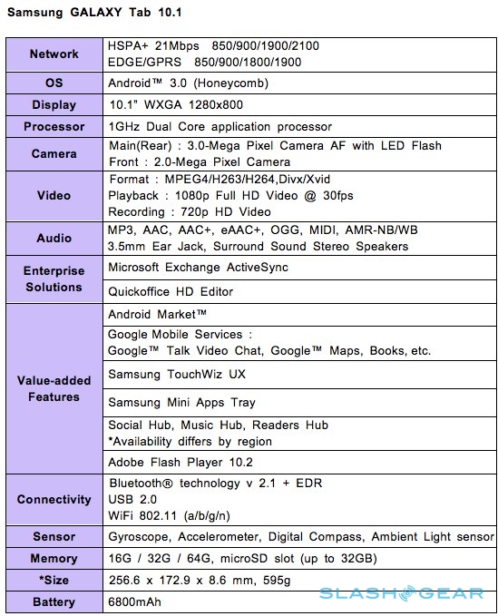 GALAXY Tab 10.1, with its WXGA TFT LCD display (1280 x 800) powered by 1GHz dual core AP, is 8.6mm thin and weighs only 595g. It is the perfect device for sharing and enjoying media content with family and friends. In addition, with its surround-sound stereo speakers and support for Flash 10.2, the GALAXY Tab 10.1 will deliver premium entertainment experience whether watching videos, movies or playing games.