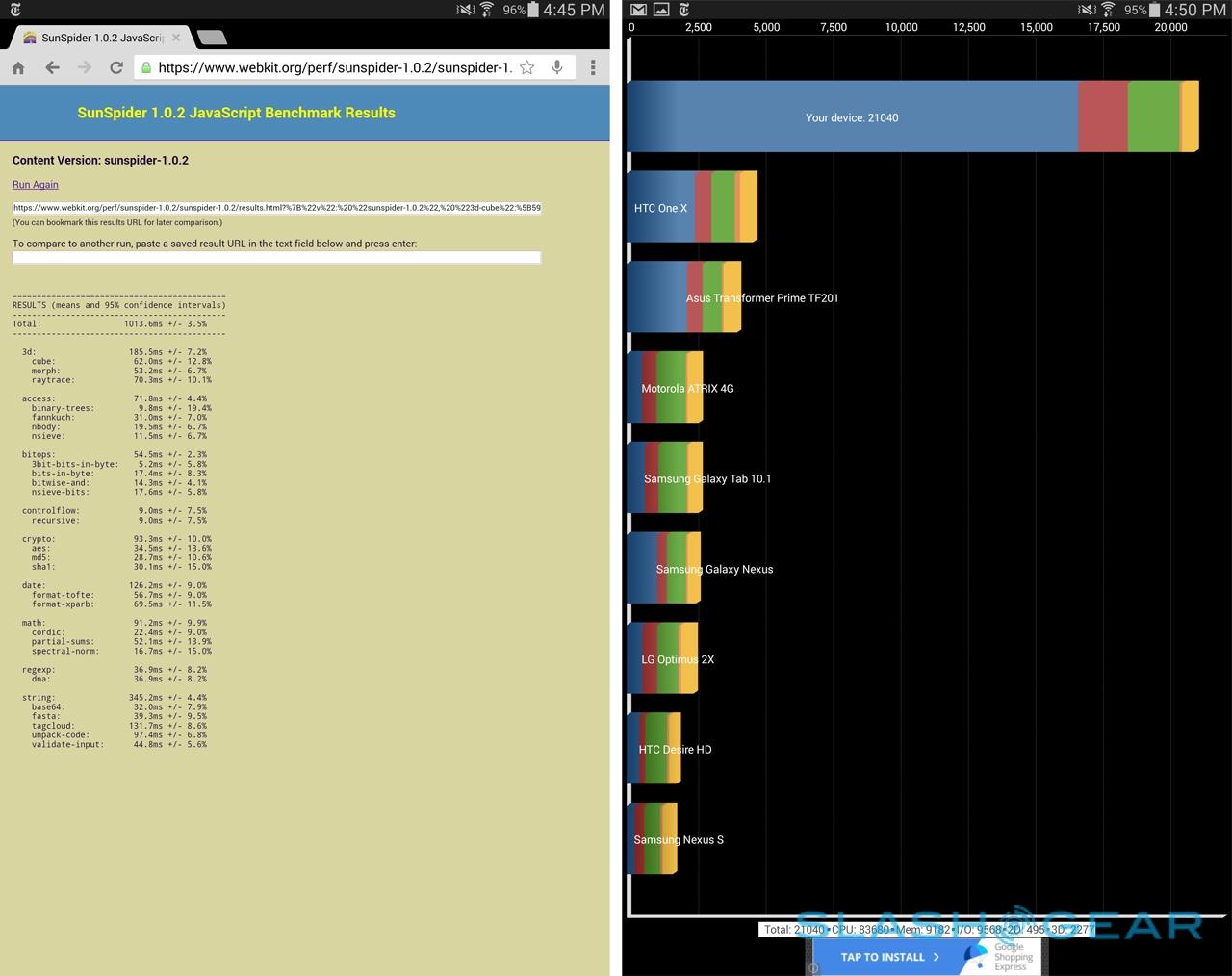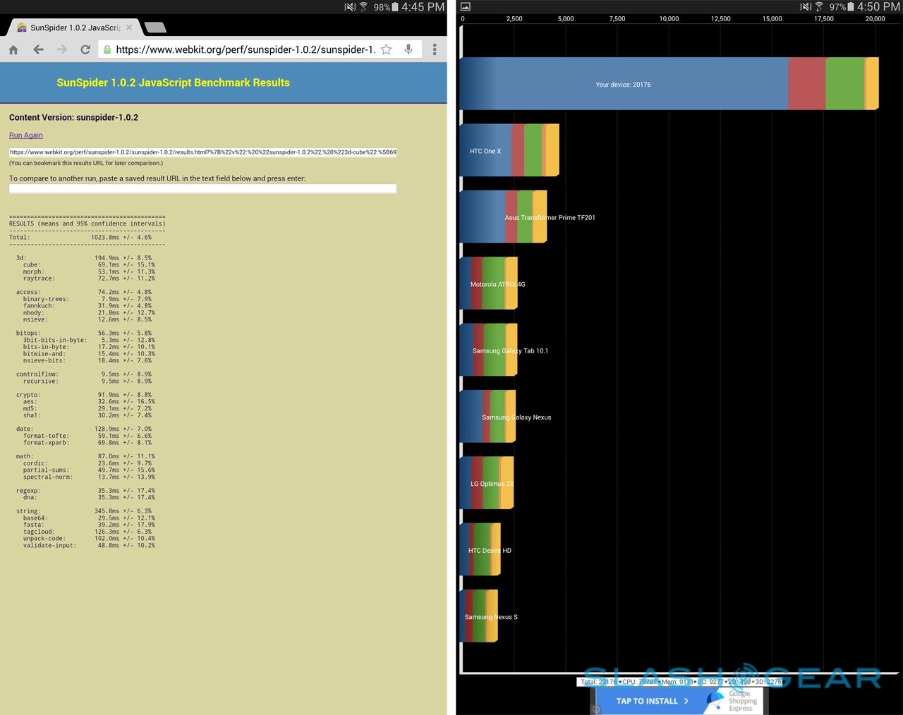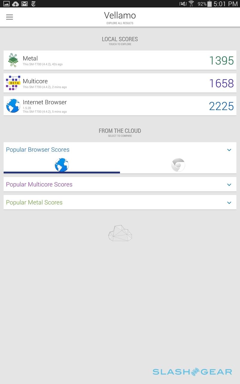 I'm yet to test the Snapdragon 800 version of the Galaxy Tab S, but the Exynos-powered version moves swiftly. At times there were very minor graphical jitters, though they were infrequent, and most of the time apps switched with no lag, webpages scrolled smoothly, and high-resolution images and video were hiccup-free.