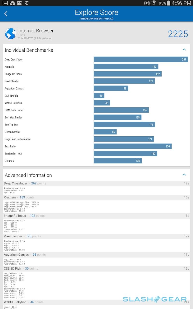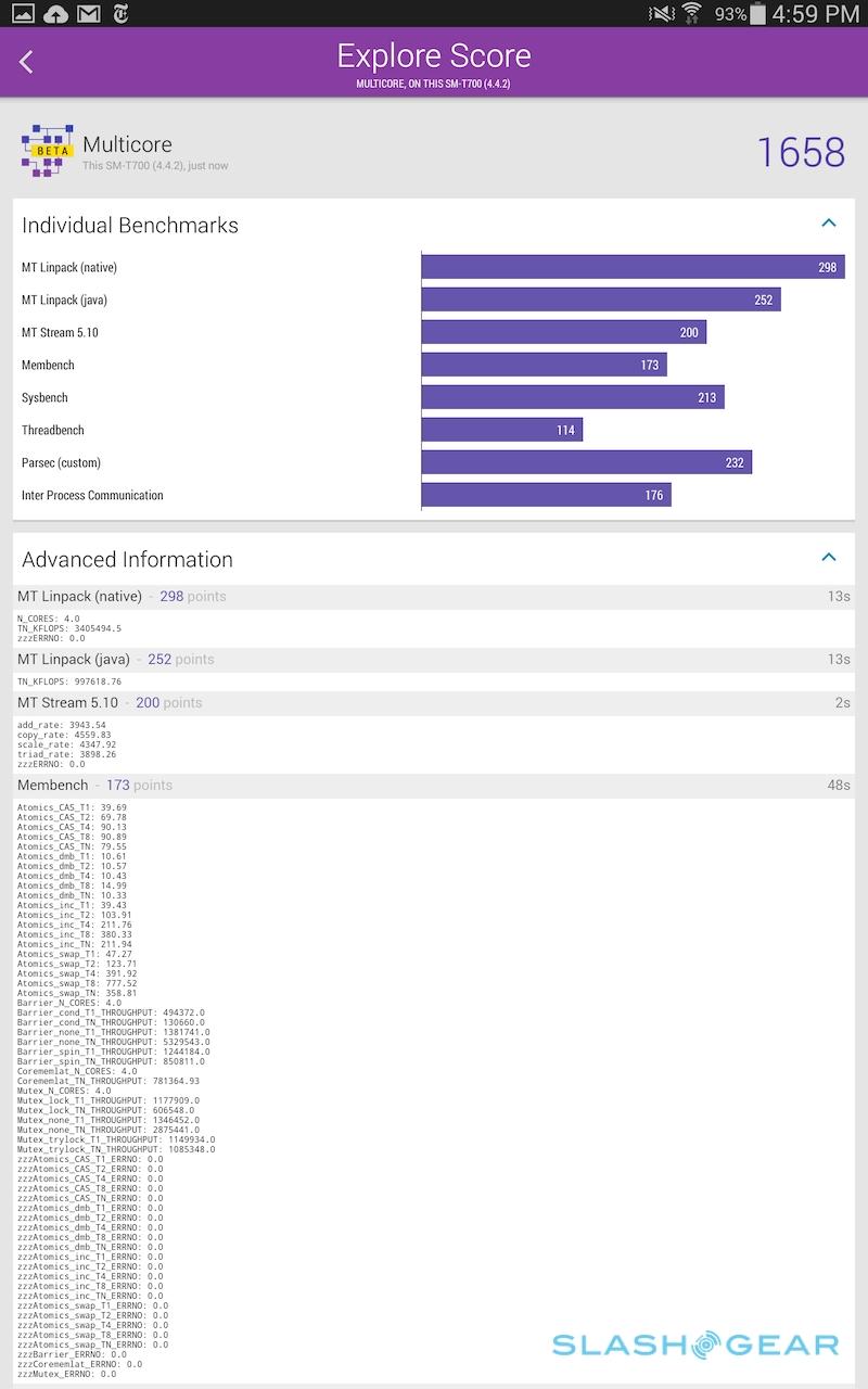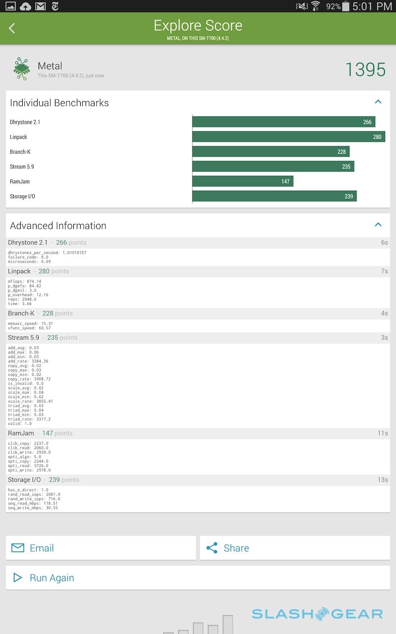 As for battery life, Samsung quotes up to 10 hours from the 4,900 mAh battery in the Tab S 8.4, and up to 9 hours from the 7,900 mAh battery in the Tab S 10.5. I'm still running through the full gamut of power testing, though early indications are positive. In mixed heavy use – a combination of browsing, some video playback, ebook reading, and music, indoors with the display set to automatic, and I got through the day with juice to spare.