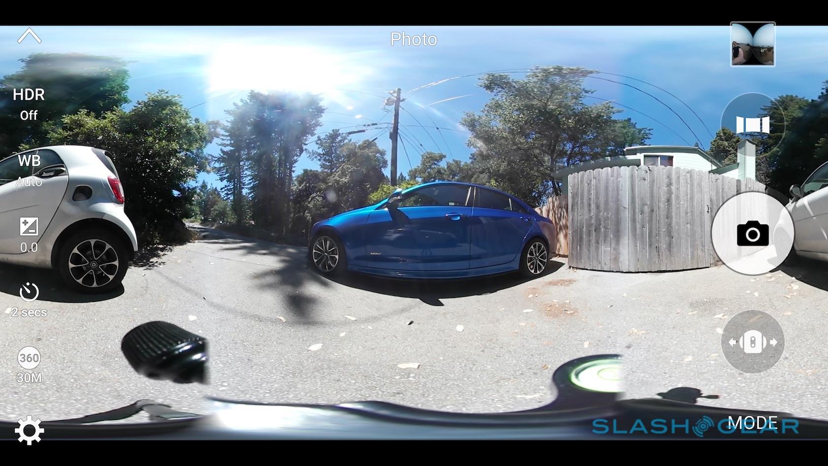Manual settings include white balance, ISO from 400 to 1600, exposure from +/- 3.0 in 1/10th of a stop increments, and resolution, as well as the ability to toggle HDR and sharpness on/off. If you're in time-lapse mode you can adjust the interval between shots in the app too; the Gear 360 remembers your most recent setting, even if it's powered off or disconnected from your phone.