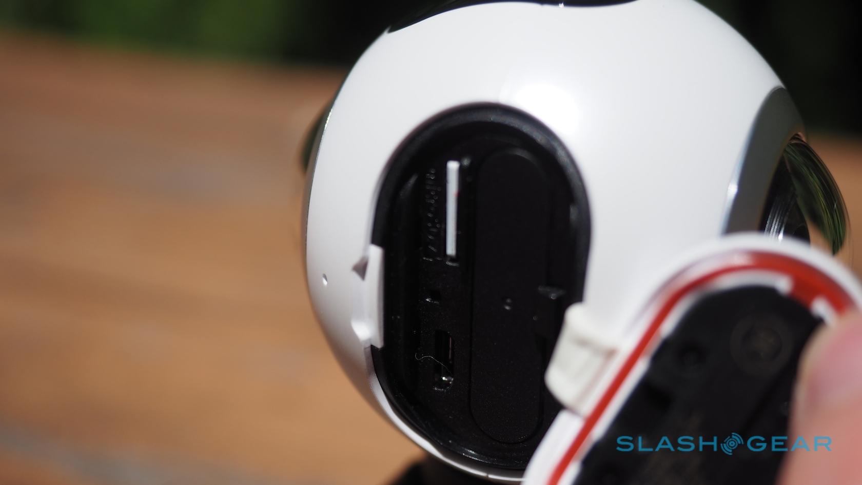 You can't accuse the Gear 360 of being discrete. Samsung has opted for an aesthetic I'm calling "tiny octopus robot" rather than the slim candybar that Ricoh, LG, and others have adopted. It looks good, and Samsung's plastics feel sturdy, but it's hardly pocket-friendly: while you can slip a Theta S into your front jeans pocket, trying to do the same with the Gear 360 is a non-starter.