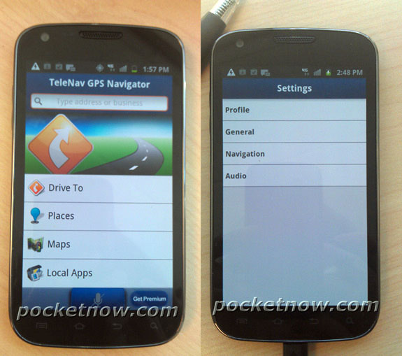 There's of course a camera on the front as well, and if these photos are indeed correct, will be rocking the TeleNav GPS app out of the box and will have model number SGH-T989. Three of these photos come from TmoNews, the front, the back, and the model number, and the TeleNav image comes from PocketNow. The PocketNow image(s) look to be slightly less expanded near the bottom of the display, but this could just be the camera angle at which they've all been photographed.