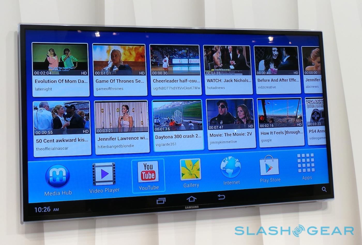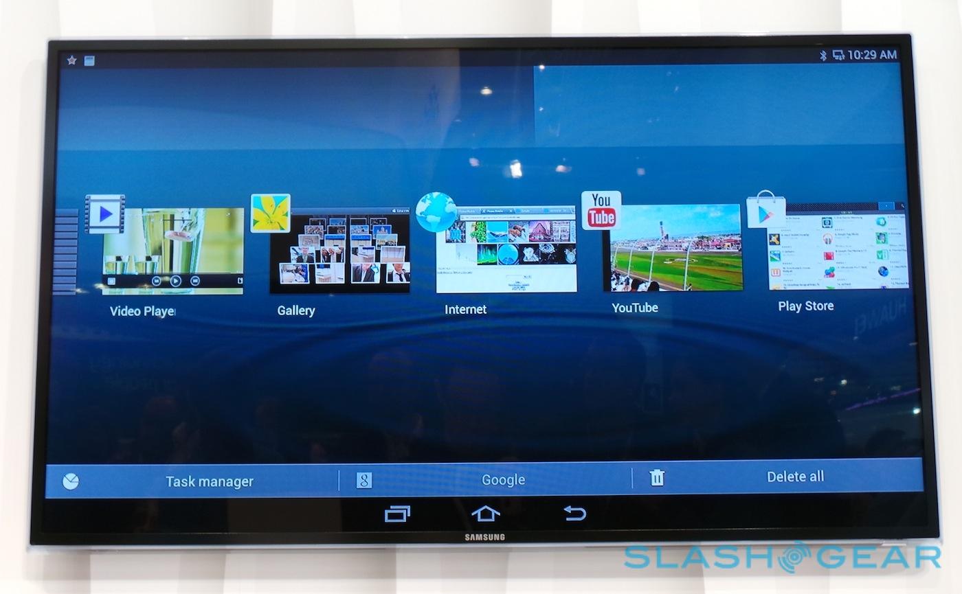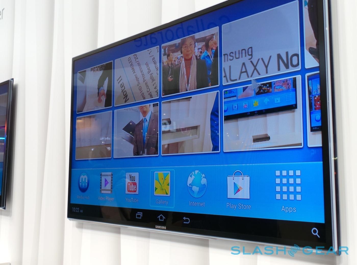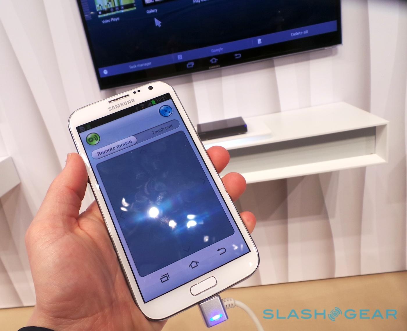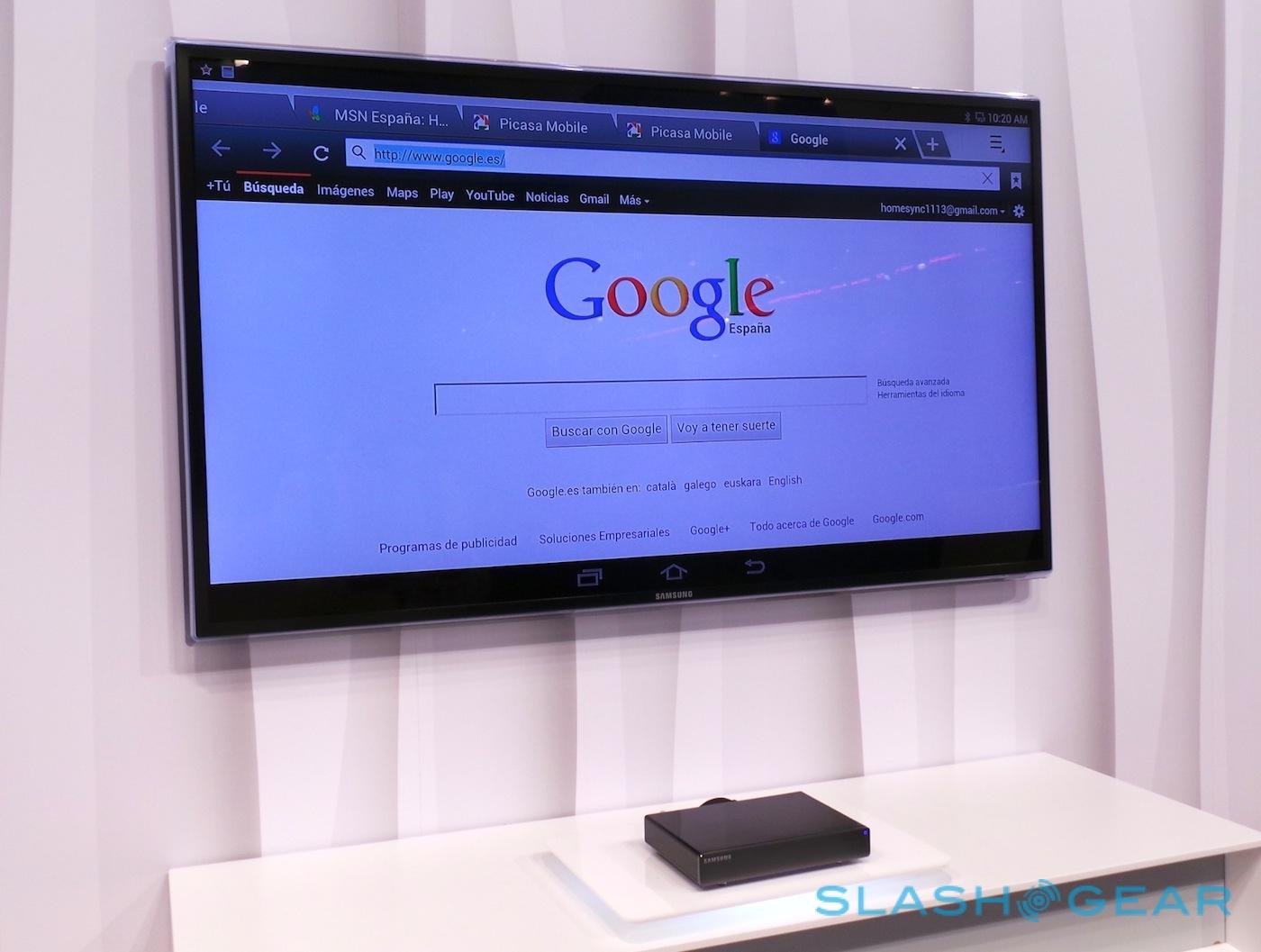 Android 4.2 Jelly Bean is running under the hood, with a customized UI to suit the living room environment. An app on your Samsung phone turns it into a wireless keyboard and remote – the display can either be used as a traditional trackpad, or you can physically wave the phone around to move the on-screen mouse cursor – with NFC used to easily pair handset to STB.