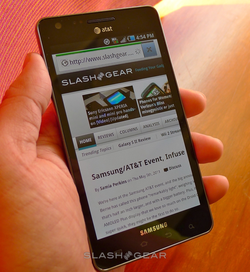 The 1.2GHz Hummingbird processor may not be the dual-core of the GSII but it's still enough to keep Froyo moving swiftly. Android looks impressive blown up to 4.5-inches, though we can imagine the Infuse 4G will be too big for many users. We'll have to wait to see how well AT&T's HSPA+ network performs when we have more time with a review unit; previously we've not been as impressed as with Verizon's LTE, though both carriers are pumping investment into boosting speed.
