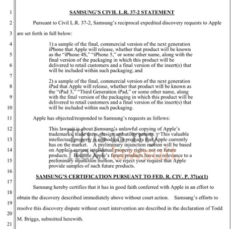 What we're seeing here is a motion filed Friday night by Samsung's lawyers that requests Apple deliver their plans for the iPhone 5 and iPad 3 "final, commercial version(s)", including both the units and the final versions of the packaging as well as the inserts that will be a part of them. Samsung's reasoning is that these devices will be on the market at the same time as the DROID Charge and the Galaxy Tab 10.1 and they'd like to prepare potential legal action in case the devices show enough similarity to their counterparts.