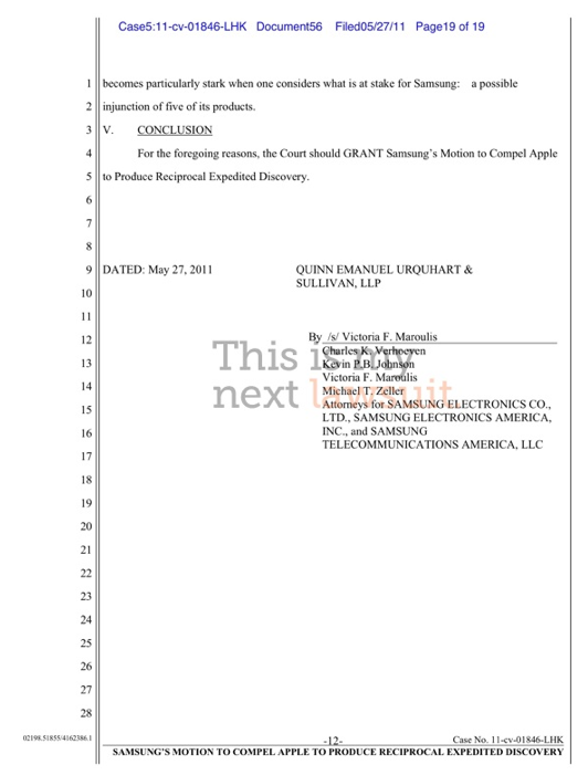What does this mean? I wont go into too massive a torrent of analysis here, but basically it means there isn't going to be an inch of advancement allowed on either side of the line drawn in the sand. Samsung notes that they want the "final, commercial versions" of the devices by June 13, 2011 OR, if these devices aren't available at that time, they'll accept "the most current version of each to be produced instead." Samsung doesn't appear to KNOW that Apple is producing new versions of the iPad or the iPhone, but everyone in the world "knows," if you know what I mean. They're acting off of "internet reports" and "Apple's past practice."